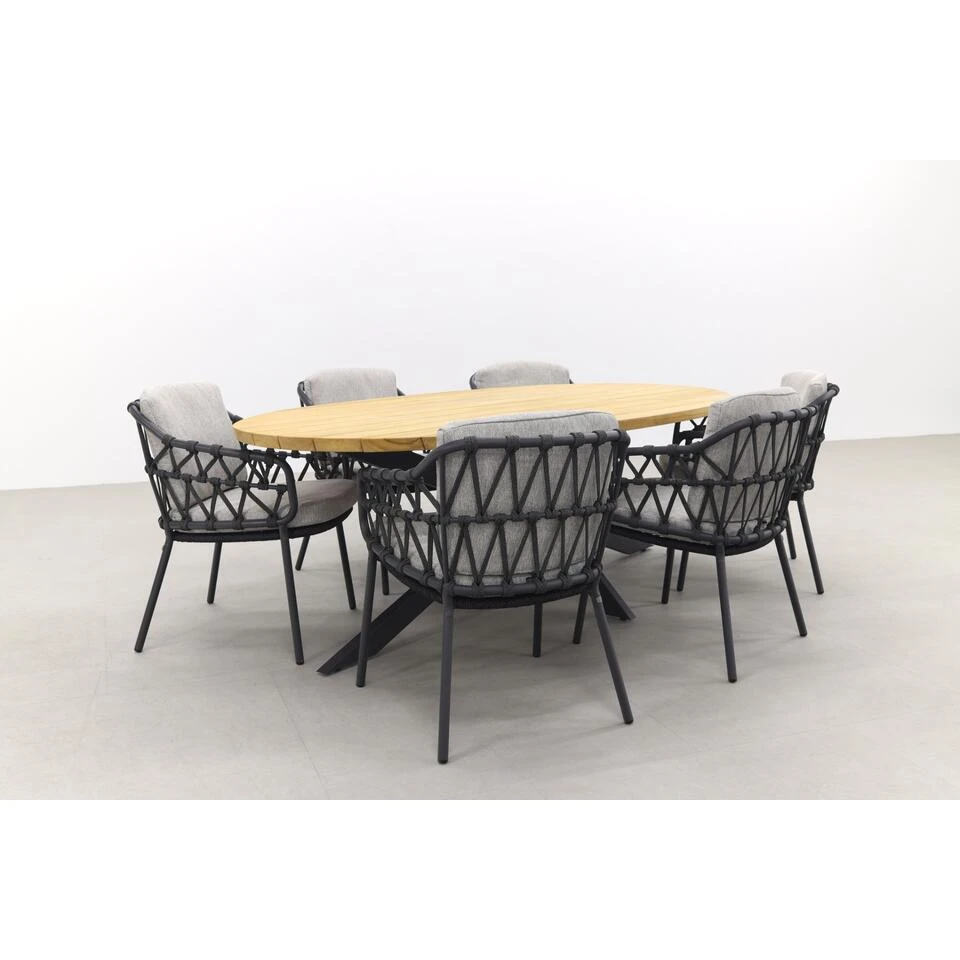 Vind jij design net zo belangrijk als comfort? Dan zit je met deze Calpi/Prado Ellips tuinset voor 6 personen helemaal goed! Dit komt mede door de zachte mee geleverde kussens, maar ook vanwege de prachtige vormgeving. De Calpi tuinstoelen van 4 Seasons Outdoor hebben een uniek touwpatroon over een antraciet frame. Deze donkere kleur steekt prachtig af bij het lichtgrijs van de weersbestendige kussens. De combinatie met de ovale Prado Ellips tuintafel van Taste gaat perfect! Het antracieten onderstel van de tafel past precies bij het frame van de stoelen. Het teakhouten tafelblad in ovale vorm zorgt ervoor dat dit een echte blikvanger is in jouw tuin! Bestellen kan direct online.