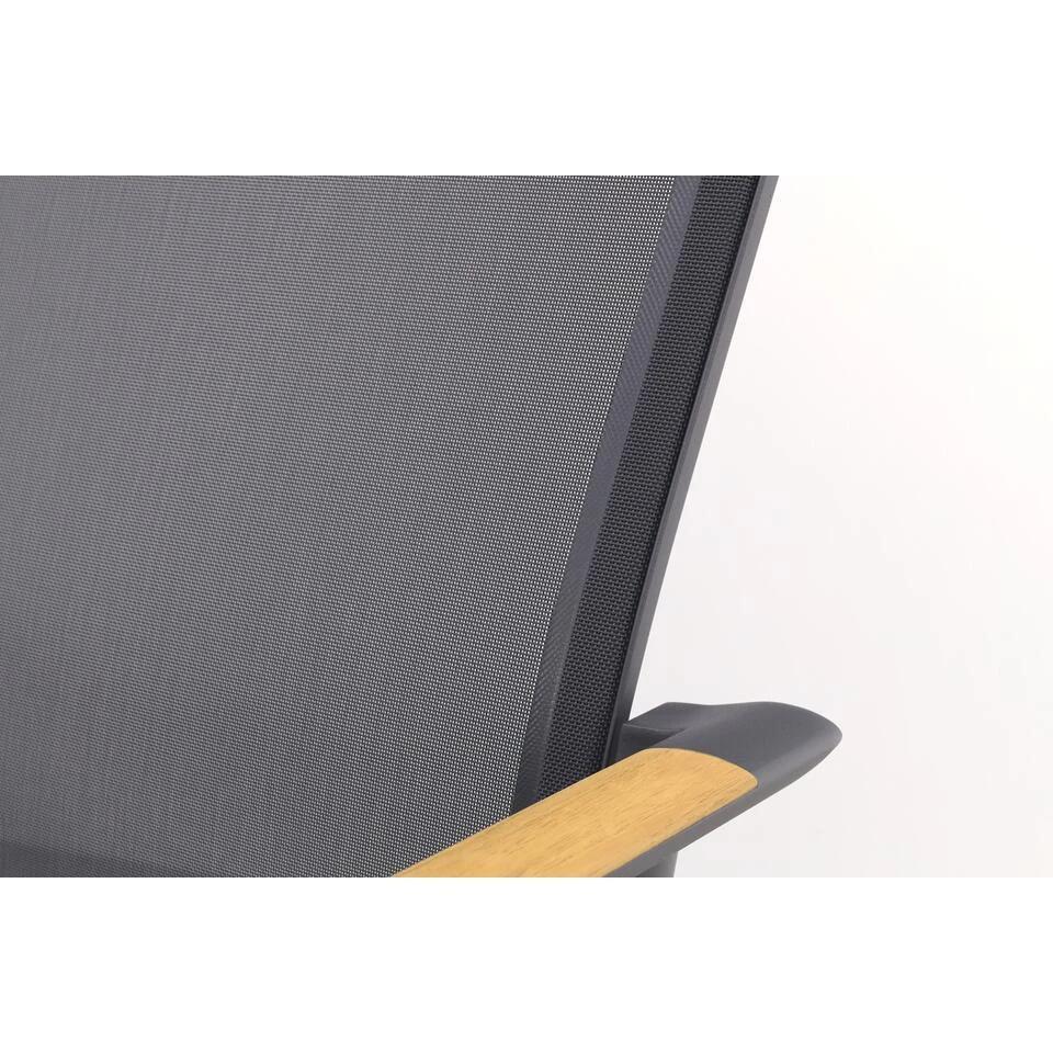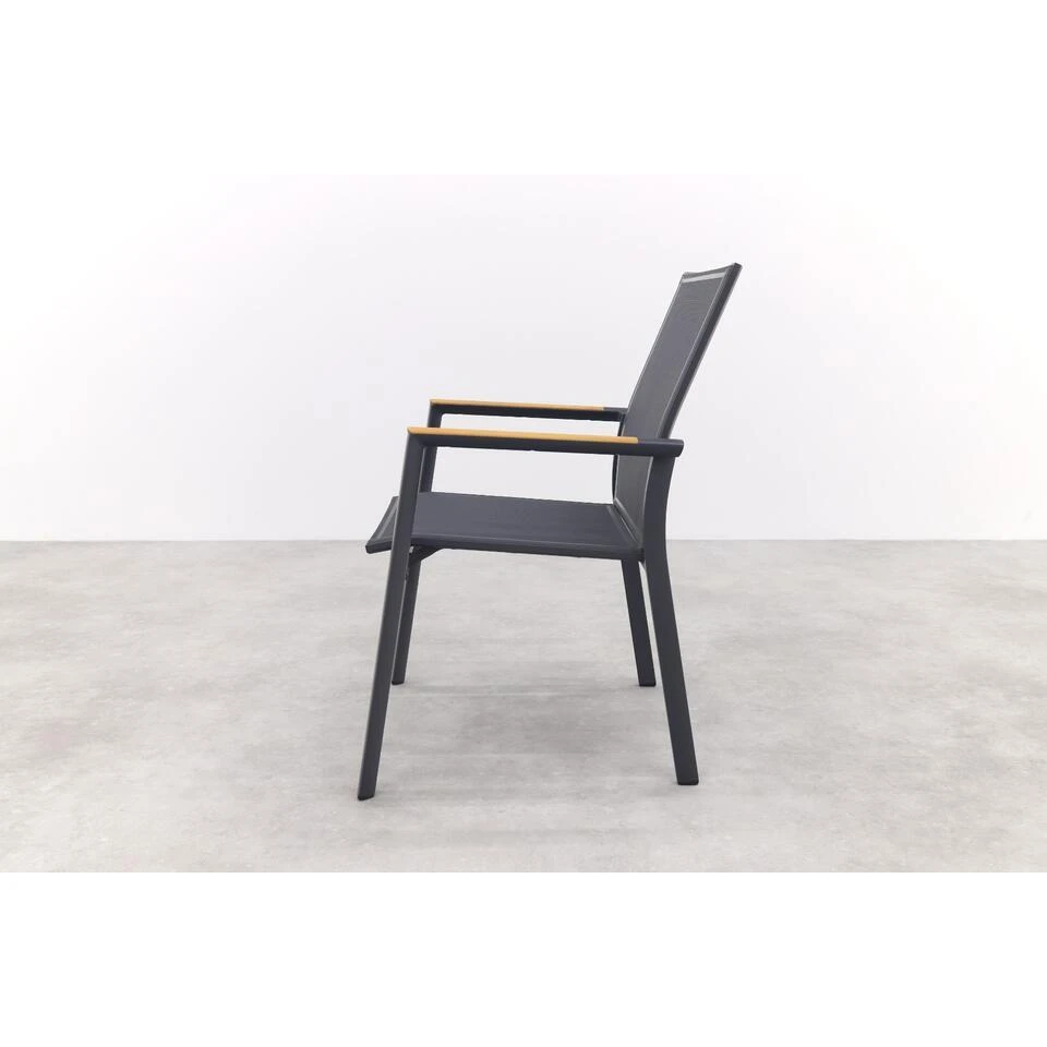 De stoel is makkelijk te verplaatsen omdat het frame van aluminium is gemaakt en daardoor licht van gewicht is. Om het frame extra te beschermen, heeft het een antracietkleurige poedercoating gekregen. Nu is de stoel ook verkrijgbaar met mooie armleuningdetails van teakhout. Dit maakt de stoel modern en warm tegelijk. De zit- en rugleuning van de Atmos stapelstoel zijn van textileen. Dit is een zacht en comfortabel geweven nylon draad. Dus, zelfs zonder kussen, zit de stapelbare tuinstoel van Atmos heel lekker.