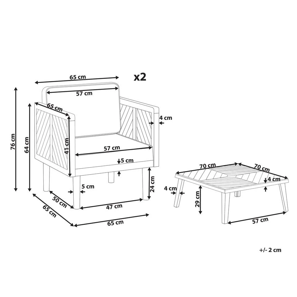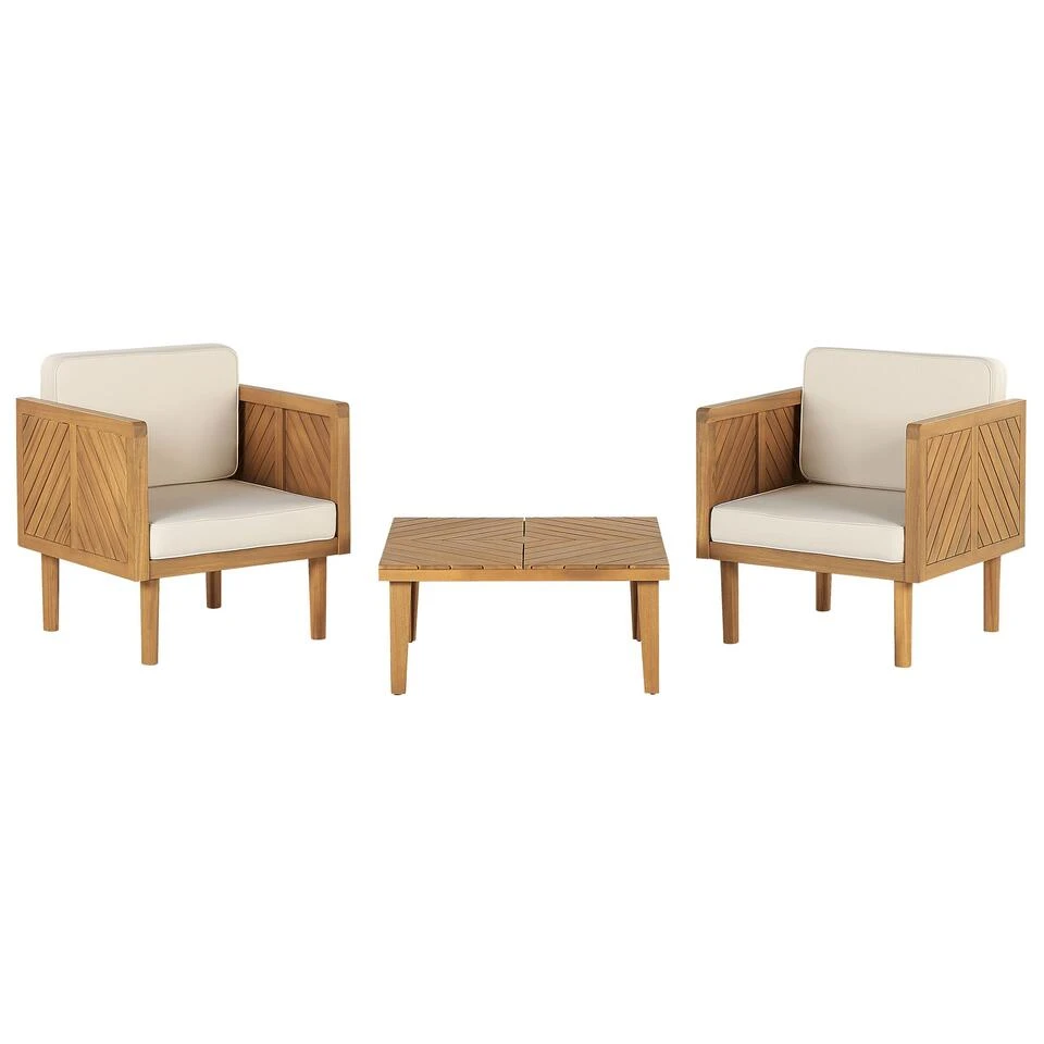 Moderne tuinstoelen set met salontafel. Creëer een moderne en comfortabele ontspanningsruimte op je terras met deze set tuinstoelen met salontafel. De meubels van hoogwaardig acaciahout zijn duurzaam en solide. Ze passen perfect in elke buitenruimte en voegen een natuurlijke uitstraling toe. De meegeleverde crèmewitte kussens bieden de juiste ondersteuning en extra comfort. Geniet van het buitenleven terwijl u ontspant in deze comfortabel zachte tuinstoelen.