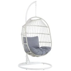 Ronde hangstoel met stalen frame voor binnen en buiten, inclusief kussens. Het opvallende ontwerp van deze hangstoel van robuust polyrotan en polyester zorgt voor een romantisch en zorgeloos vakantiegevoel op de veranda of in de slaapkamer. De gevlochten stoel is opgehangen aan een zware metalen ketting, die op zijn beurt is bevestigd aan een zeer stabiel stalen frame. Zo biedt de stoel rustgevende, subtiele schommelingen en laat je zweven op het comfortabele, waterbestendige zitkussen, zoals op een wolk in de lucht.
