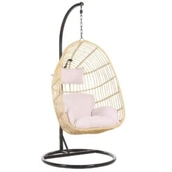 Moderne hangstoel in beige met zwart frame inclusief kussens. Een stabiel stalen frame gecombineerd met een prachtige gevlochten mand in een kleur die in elk interieur past en een feel-good karakter aan de ruimte geeft. Dankzij het sterke ketting-ophangsysteem kun je heerlijk heen en weer schommelen. De charmante boho-look van dit model en de zachte, waterbestendige kussens zorgen voor een onbezorgd gevoel, zodat het verblijf op de veranda, het balkon of in de slaapkamer een heerlijk avontuur wordt.