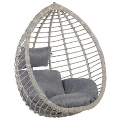 Moderne hangstoel voor binnen en buiten gemaakt van rotan inclusief kussens. Deze mooie rotan hangstoel met een boho-uitstraling past in elk interieur en staat geweldig op je balkon of terras. De dik gewatteerde, waterbestendige kussens in grijs zijn zeer comfortabel en maken van de stoel een perfecte plek om te schommelen, ontspannen of lezen.