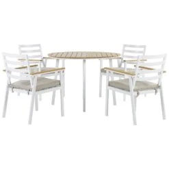 Tweekleurig tuinset met vier stoelen. Praktisch en mooi om te zien – de hoogwaardige afwerking van gepoedercoat aluminium in wit wordt vakkundig aangevuld met armleuningen in een warme houtlook. Door deze kleur- en materiaalcombinatie ademt de set een moderne en zeer gezellige sfeer uit. Dankzij de extra grijze zitkussens staat niets langere maaltijden en een gezellige samenkomsten in de weg.