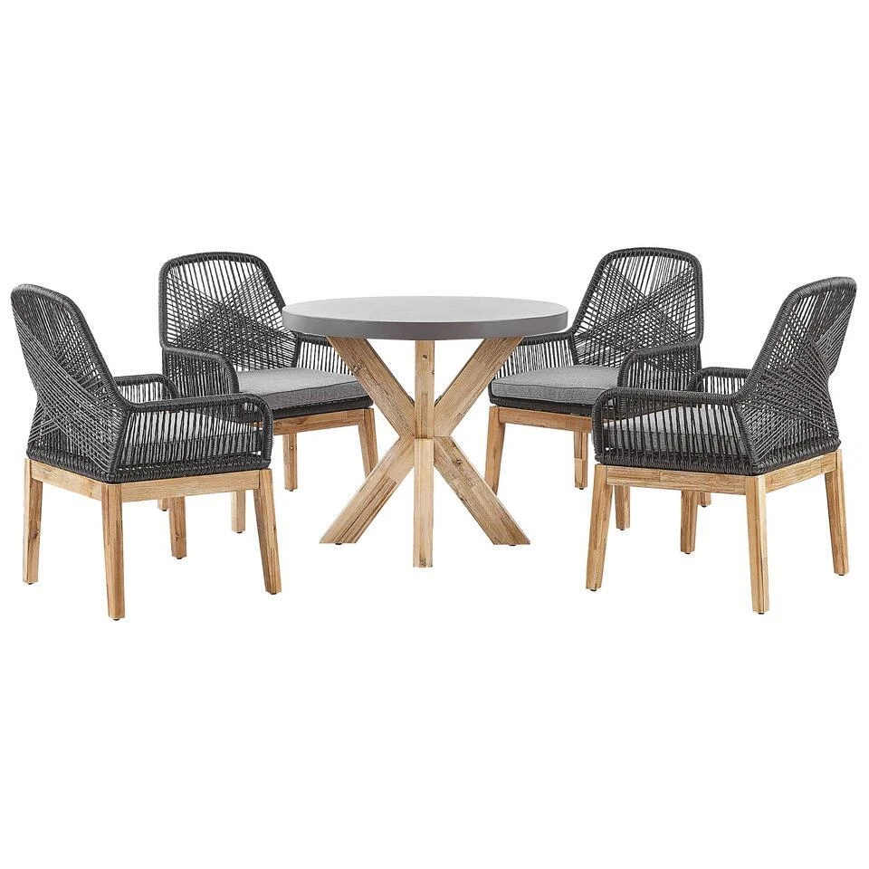 Modern tuinset met ronde tafel van vezelcement en vier stoelen. Deze tuinset geeft je een fijne eethoek in je tuin of op je terras. Perfect voor een gezellig familieontbijt of een brunch met vrienden. Aan de ronde tafel met de bijpassende stoelen is genoeg ruimte voor vier personen. Alle onderdelen van dit tuinset zijn gemaakt van onderhoudsvriendelijke, duurzame en weerbestendige materialen. Het tafelblad is gemaakt van vezelcement, de stevige onderstellen van het meubilair zijn gemaakt van acaciahout.