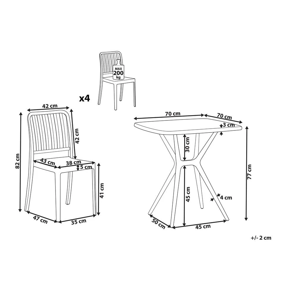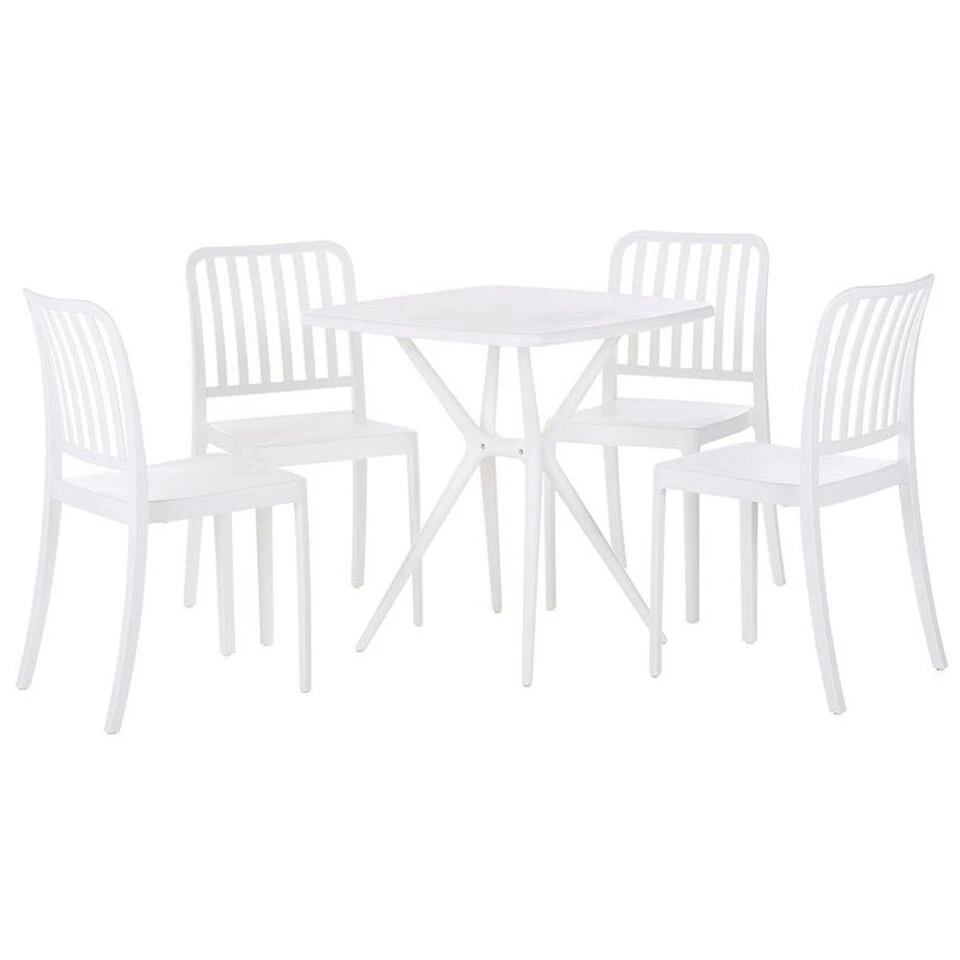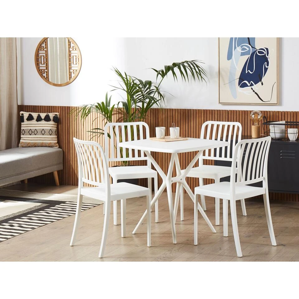 Praktische 5-delige tuinset van kunststof. Geniet van warme, zonnige dagen in de tuin of op het balkon met deze sfeervolle eethoek. Zowel de stoelen als de tafel zijn gemaakt van duurzaam kunststof, zodat ze gemakkelijk kunnen worden vervoerd en zelfs door de lenteregen niet zullen beschadigen. De vierkante balkontafel biedt voldoende ruimte voor een kopje koffie of lunch buiten, en bij slecht weer kun je deze buitenmeubels ook binnen gebruiken. Dankzij de witte kleur en het minimalistische design is de set gemakkelijk te combineren met elke moderne sfeer.