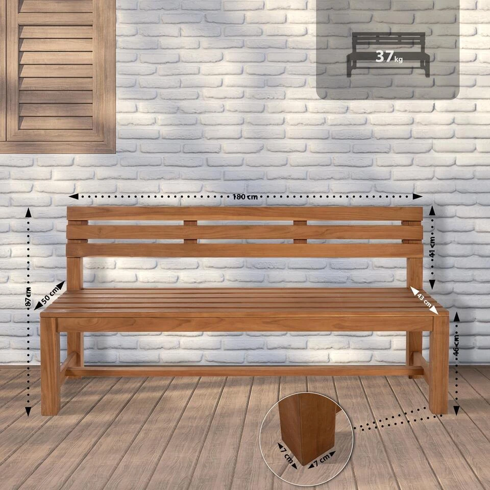Het gebruikte teakhout is volledig weerbestendig, dus de bank kan het hele jaar door aan de elementen worden blootgesteld. Zelfs vorst en sneeuw zullen het hout niet beschadigen, terwijl het massieve hout voorkomt dat er schimmel of rot ontstaat. Als er geen teakolie wordt gebruikt, krijgt het hout alleen een grijze patina, wat niets afdoet aan de duurzaamheid en stabiliteit.