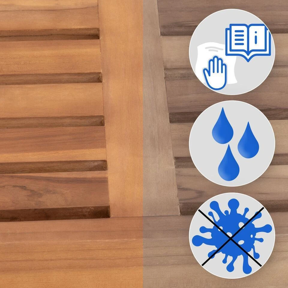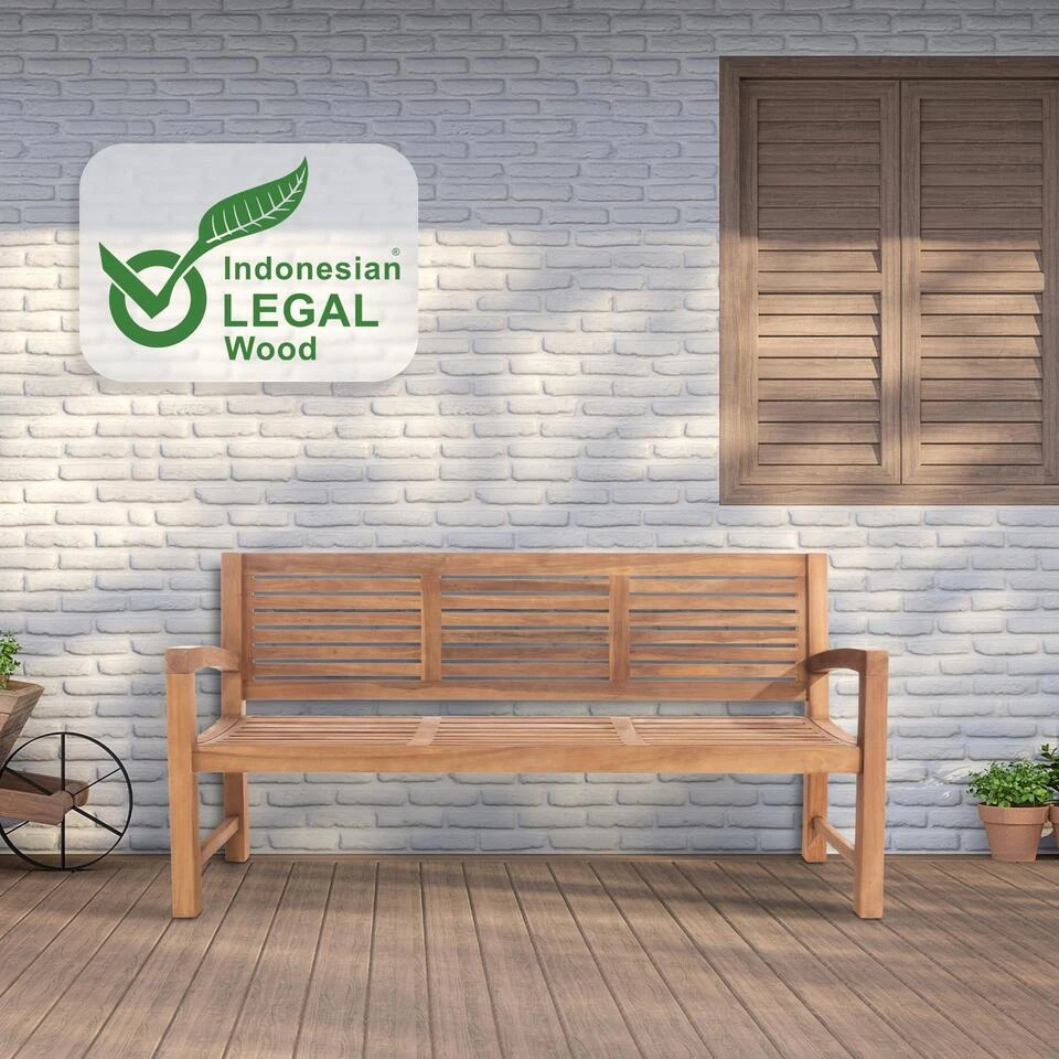 Met de solide zitbank van massief teakhout kunt u ontspannen van de natuur genieten. Het uiterst hoogwaardige en duurzame materiaal is gericht op comfortabel zitcomfort. Als mooie details bevallen het tijdloze spijlenontwerp, het licht gebogen zitvlak en de aangenaam schuine rugleuning. De comfortabele armleuningen maken het geheel compleet. De stevige poten bestaan uit 6×6 cm dikke massief houten balken. Teakhouten tuinmeubelen kunnen het hele jaar door buiten staan. Voor het behoud van de kleur wordt aanbevolen om geschikte onderhoudsolie voor teakhout te gebruiken, die indien nodig verkrijgbaar is bij gespecialiseerde winkels.