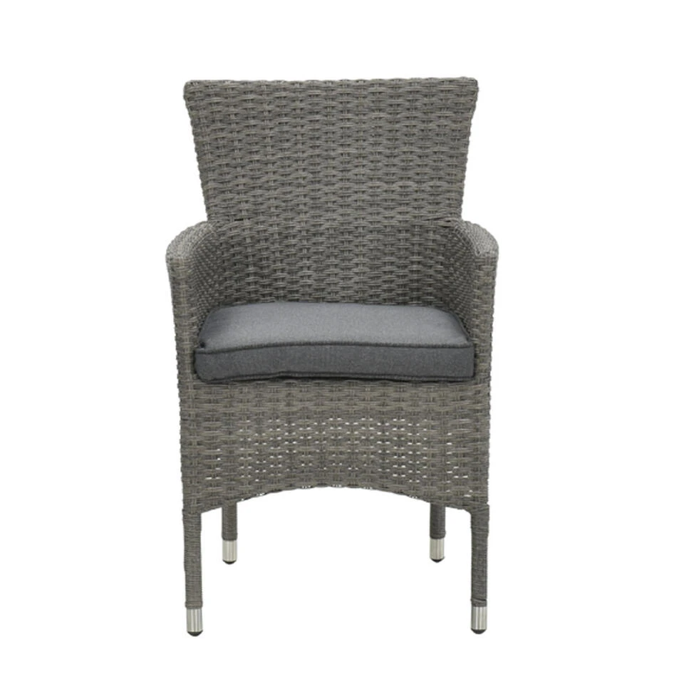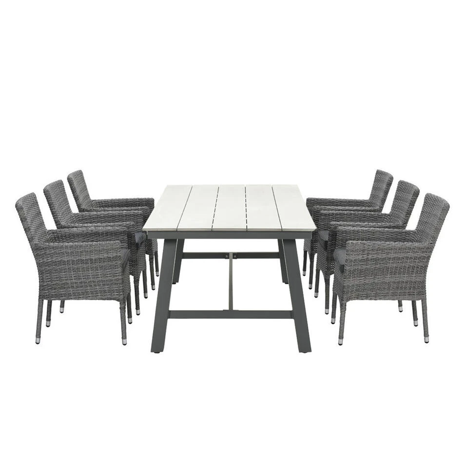 Ben je op zoek naar een mooie tuinset met wicker vlechtwerkdraad stoelen? Dan is de Jerba 7-delige tuinset met Moreno tuintafel wat voor jou. De Jerba tuinstoel wordt geleverd inclusief zitkussen. De Jerba tuinstoel is stapelbaar en daardoor eenvoudig op te bergen. De tuintafel heeft een aluminium frame met daarop polywood planken. Polywood is weerbestendig en gemakkelijk in het onderhoud. Polywood is een kunststof met de uitstraling van hout. De tuinstoel heeft een afmeting van 60 x 58 x 87 cm en de tuintafel 250 x 100 x 75 cm.