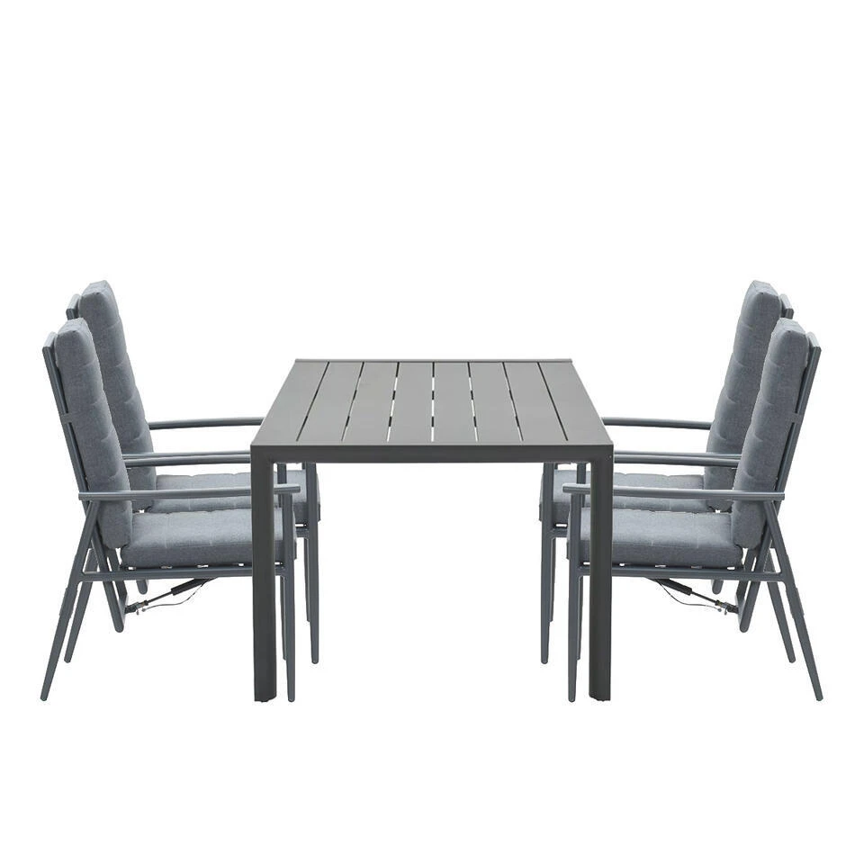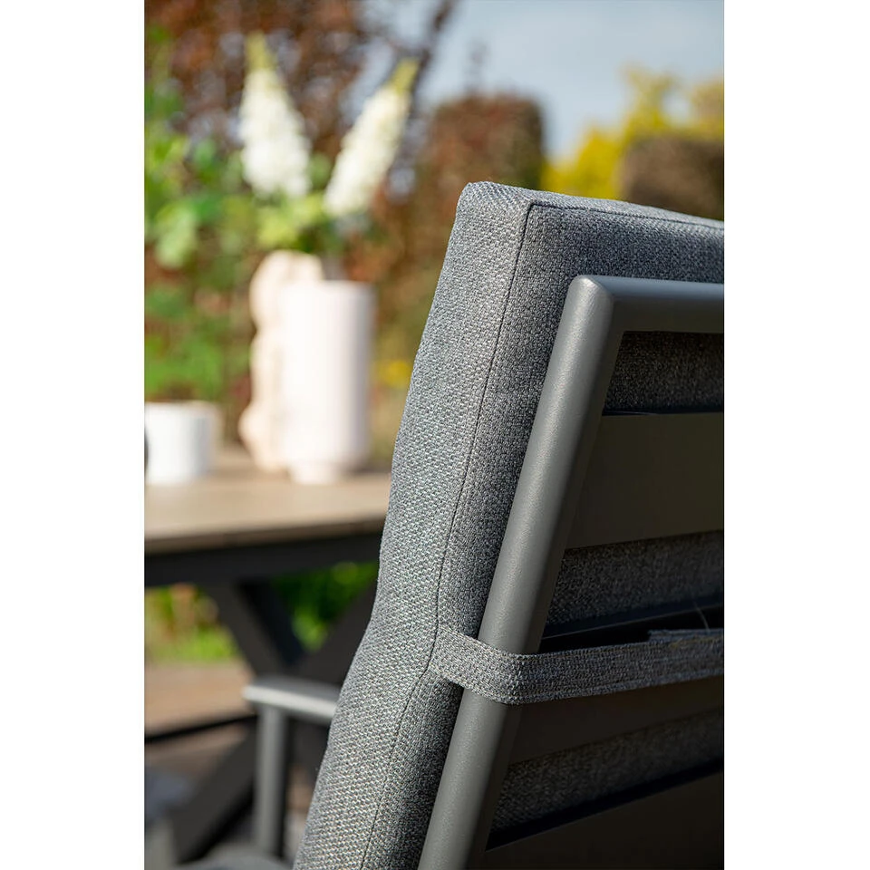De tuinstoel heeft een frame dat gemaakt is van aluminium. De tuinstoel wordt geleverd met dik comfortabele kussen. De Adana tuintafel is gemaakt van aluminium en is voorzien van een stevige poedercoating. Aluminium heeft als voordeel dat het onderhoudsvrij is, wanneer het aluminium vies is geworden door bijvoorbeeld opspattend regenwater kun je dit eenvoudig schoonmaken met een sopje van groene zeep en een zachte doek.
