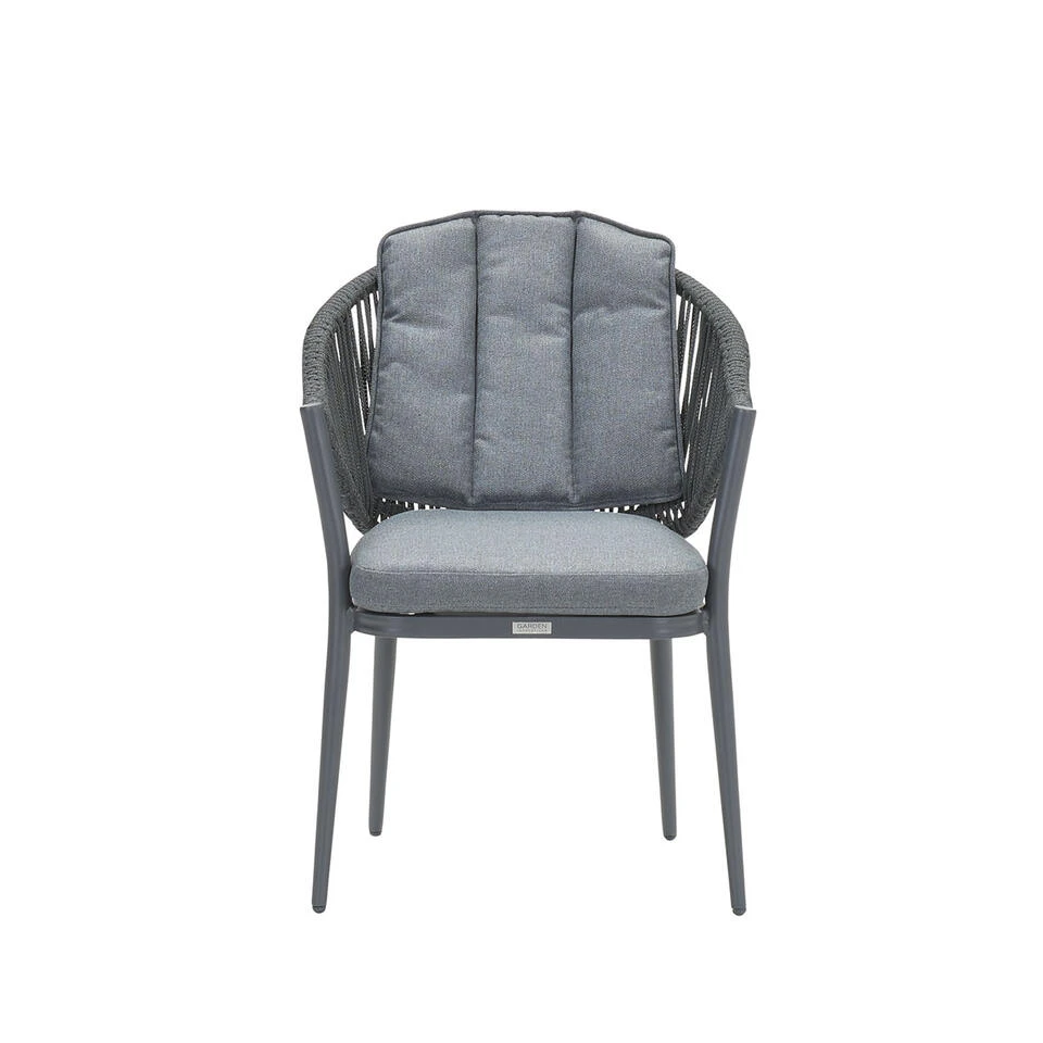 De Kyra tuinstoel is vervaardigd uit een onderhoudsvrij aluminium frame met een stevige poedercoating. Om dit aluminium frame zit 8 mm dik hoogwaardige kwaliteit donker grijs gekleurd touw. Dit touw is te vergelijken met touw dat in de scheepsvaart gebruikt wordt. Het touw is voorzien van een rubberen kern binnenin met daarin meerdere polyester draden voor de stevigheid. Om de rubberen kern zit solution dyed polyester rope. Dit betekent dat het touw door en door gekleurd is en verkleurt veel minder snel.