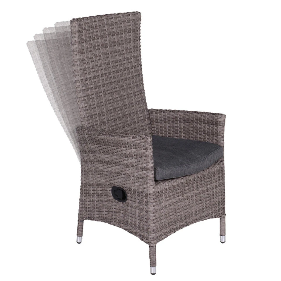 De Nice verstelbare tuinstoel van kwaliteitsmerk Garden Impressions is een heerlijke wicker tuinstoel waarin je actief kunt zitten, maar ook heerlijk achterover kunt liggen. Heb je de behoefte om de rugleuning een klein beetje of bijna helemaal plat naar achteren te doen, dan kan dat! De Nice verstelbare tuinstoel is vervaardigd uit een onderhoudsvrij aluminium frame. Daaromheen is, met de hand, weerbestendig 2-half wicker vlechtwerkdraad in de kleur organic grey gevlochten. Het wicker is gemaakt van een stevige kunststof waardoor de set zeer duurzaam is. Deze stoel wordt compleet geleverd met een polyester zitkussen van hoogwaardige kwaliteit. Het zitkussen is bovendien voorzien van een rits, waardoor het hoesje met de hand gewassen kan worden. Het kussen is niet 100% waterdicht, maar is wel voorzien van een waterafstotende coating. Dit is vooral erg praktisch als er bijvoorbeeld op het kussen wordt gemorst met drinken. Je veegt het vocht er namelijk gemakkelijk weer af. Na gebruik kan het kussen opgeborgen worden in de schuur of in een mooie kussenbox. De rugleuning van deze stoel kan gemakkelijk door middel van de gasveer in iedere gewenste stand naar achteren geplaatst worden. Hierdoor kun je heerlijk dineren in de stoel, maar ook achterover liggend genieten van de zon. Deze verstelbare wicker tuinstoel is voorzien van een gasveer van een hoogwaardige kwaliteit. Voor behoud van de gasveer is er gebruik gemaakt van een koker met kunststof sluitingsranden om de gasveer. Dit voorkomt dat er zomaar vocht bij de gasveer kan komen. Uiteraard kan door de jaren heen er wel wat vocht bij komen. Om dit zoveel mogelijk te beperking wordt er aangeraden om de stoelen bij nat of vochtig weer af te dekken met een passende beschermhoes. De afmetingen van deze stoel zijn: B 62 x D 59 x H 110 cm.
