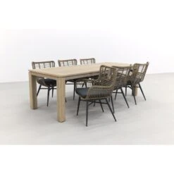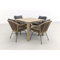 Zoek jij een kleine tuinset voor bij jouw in de tuin? Bekijk dan deze leuke Ross – Mina tuinset eens van het kwaliteitsmerk Garden Impressions. Deze set bestaat uit vier tuinstoelen en één tuintafel. Zowel de tuinstoelen als de tuintafel zijn gemaakt van aluminium. Bij de tuinstoel zit er om het aluminium frame touw gevlochten. Dit touw kun je vergelijken met touw dat in de scheepsvaart gebruikt wordt. Het touw is voorzien van een rubberen kern binnenin met daarin meerdere polyester draden voor de stevigheid. Om de rubberen kern zit solution dyed polyester rope. Dit betekent dat het touw door en door gekleurd is en verkleurt veel minder snel. De tuintafel wordt geleverd in een stevige verpakking. De tafelpoten kunnen eenvoudig worden gemonteerd met het bijgeleverde bevestigingsmateriaal. Alle benodigdheden voor de montage worden meegeleverd bij de tuintafel. Daarna kan het echte genieten beginnen. Afmeting tuinstoel: 63 x 55 x 85 cm en de tuintafel 90 x 90 x 71 cm.
