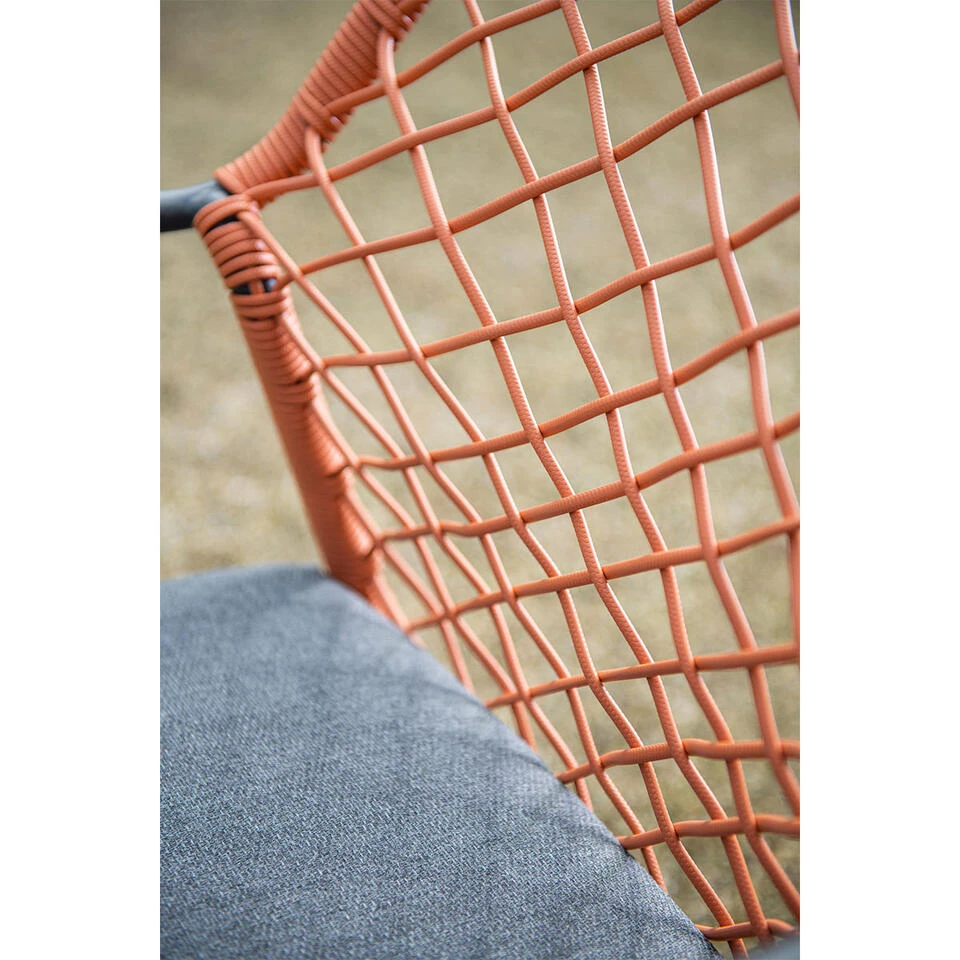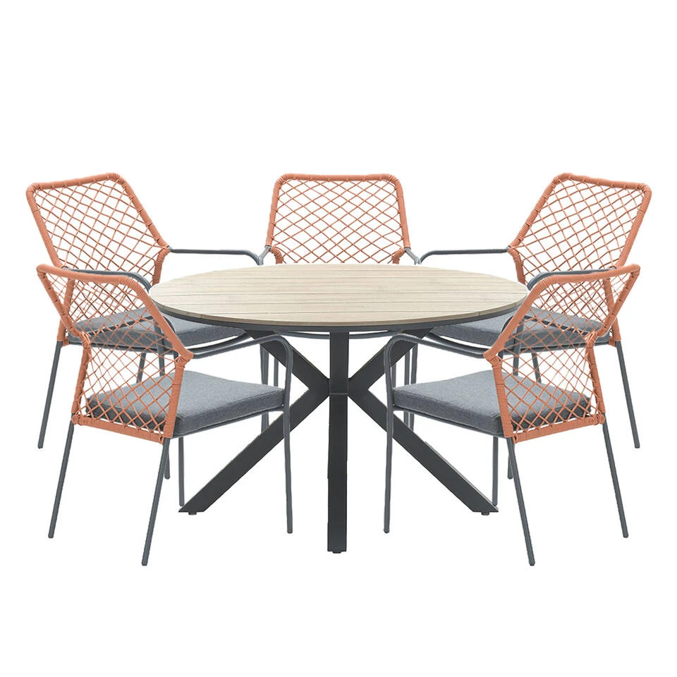 De Ross โ Tulli 6-delige tuinset heeft een ruime ronde tuintafel met vijf tuinstoelen. De tuinstoelen hebben een mooie afwerking van TPU draden. Dit geeft de stoel het uiterlijk of er touw is gebruikt. Bij de tuinstoelen worden zitkussens meegeleverd.