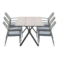 De Ross – Robin 7-delige tuinset heeft een ruime tuintafel met zes tuinstoelen. De tuinstoelen hebben een mooie afwerking van TPU draden. Dit geeft de stoel het uiterlijk of er touw is gebruikt. Bij de tuinstoelen worden zitkussens meegeleverd.