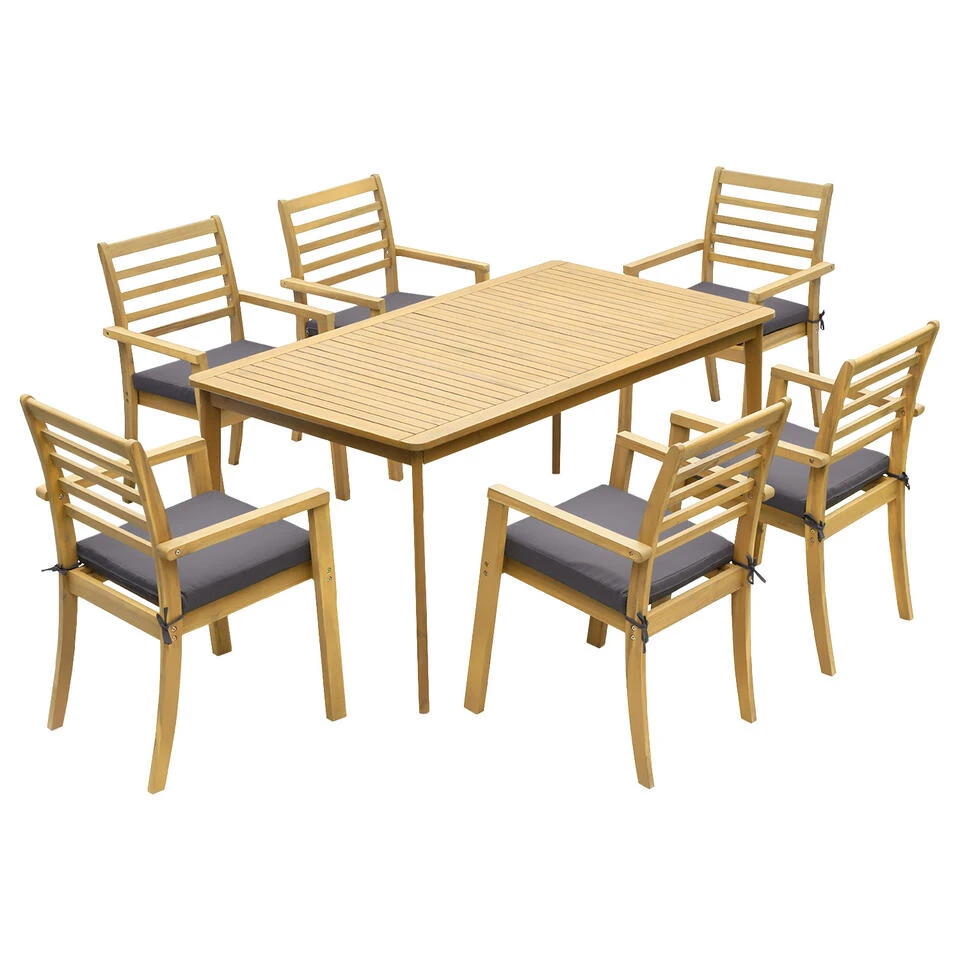 Wilt u comfortabel op uw terras van uw zomerse maaltijden kunnen genieten? Dit is mogelijk dankzij het SIMILAN model tuinmeubelen. Het is geschikt voor maximaal 6 personen in uw buitenruimte en bestaat uit 6 tuinstoelen en een eettafel. De set is ontworpen in acacia, een houtsoort die perfect past bij elke decoratiestijl en een weersbestendige kracht heeft. Het is ook een duurzaam en sterk materiaal dat u vele jaren kunt gebruiken zonder achteruit te gaan. De buitenstoelen hebben gevoerde zitkussens die het comfort van iedereen verhogen. Met deze elegante acacia tuinmeubelen kunt u de hele zomer lang genieten van pure ontspanning.