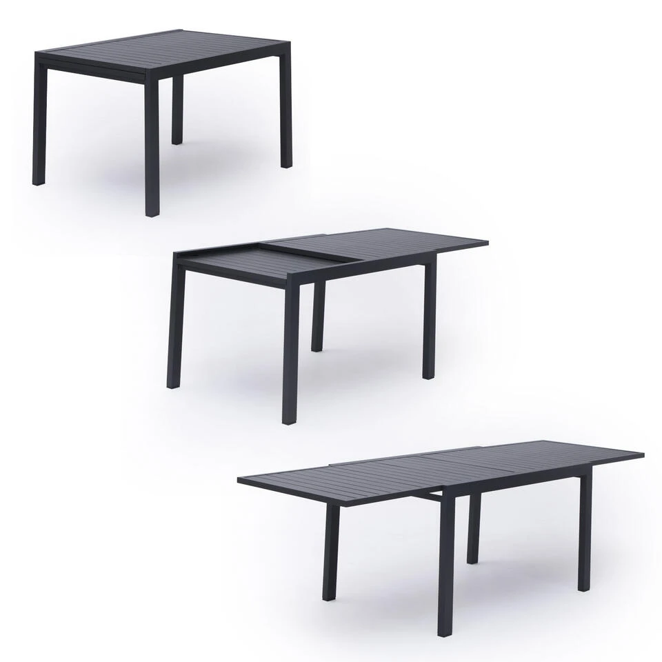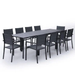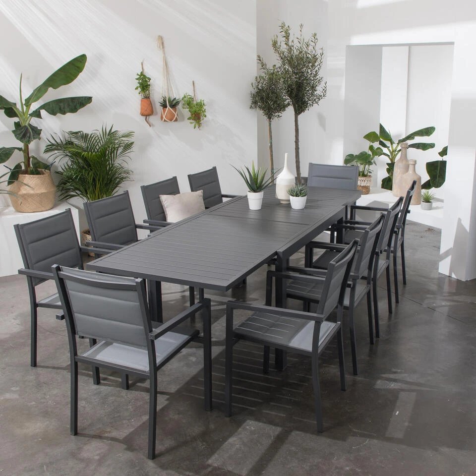 De VENEZIA tuinset bestaat uit een uitschuifbare tafel die een lengte van 264 cm kan bereiken en 10 stoelen. De aluminiumstructuur garandeert duurzaamheid en weerstand tegen buitenomstandigheden. De stoelen zijn gemaakt van gewatteerd textilene voor comfort en welzijn. De stoelen zijn stapelbaar zodat ze gemakkelijk kunnen worden opgeborgen.