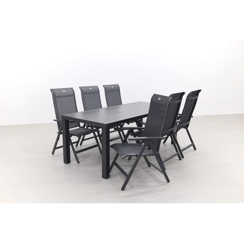 Ben je op zoek naar een stijlvolle en comfortabele verstelbare tuinset? Kijk dan eens naar onze tuinset met 6 Milaan tuinstoelen en de Lena tuintafel! De Milaan tuinstoel van Hartman is van topkwaliteit en heeft een stevig aluminium frame met een textileen zit- en rugleuning. De stoel is verstelbaar en opvouwbaar, zodat je hem makkelijk kunt opbergen. En de Lena tuintafel, gemaakt van duurzaam aluminium, heeft een ruim formaat van 210 x 90 cm en biedt plaats aan 6 tot 8 personen. Met deze tuinset ben je verzekerd van jarenlang zitplezier in je tuin. Bestel hem vandaag nog en je kunt binnenkort genieten van jouw nieuwe tuinset!ย