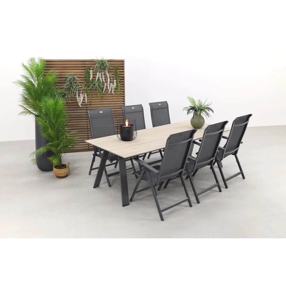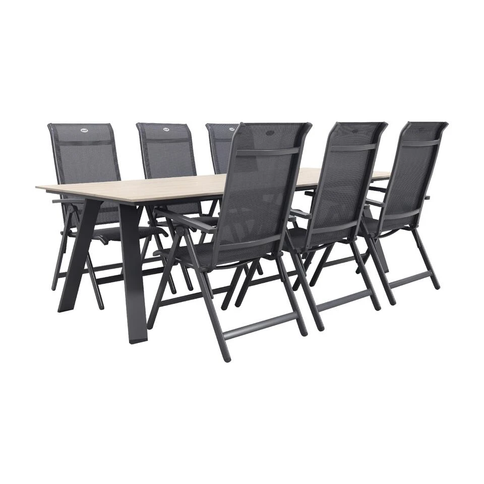 Maak van je tuin een stijlvol en functioneel paradijs met onze trendy Milaan/Nevda tuinset. Deze tuinset bestaat uit de trendy Nevada tuintafel van Garden Impressions en zes comfortabele Milaan tuinstoelen van Hartman. De Nevada tuintafel meet 240 x 100 cm. en biedt voldoende ruimte voor 6 tot 8 personen om te genieten van heerlijke maaltijden en gezellig samenzijn in de buitenlucht. De bijpassende Milaan tuinstoelen zijn verstelbaar, opvouwbaar en voorzien van een modern aluminium frame en een antracietkleurige textileen zit- en rugleuning. Deze combinatie van functionaliteit, comfort en verfijnde vormgeving zal je ongetwijfeld verleiden om je buitenruimte naar een hoger niveau te tillen. Wacht niet langer en transformeer je tuin met deze onweerstaanbare tuinset! Bestellen kan direct online!Â