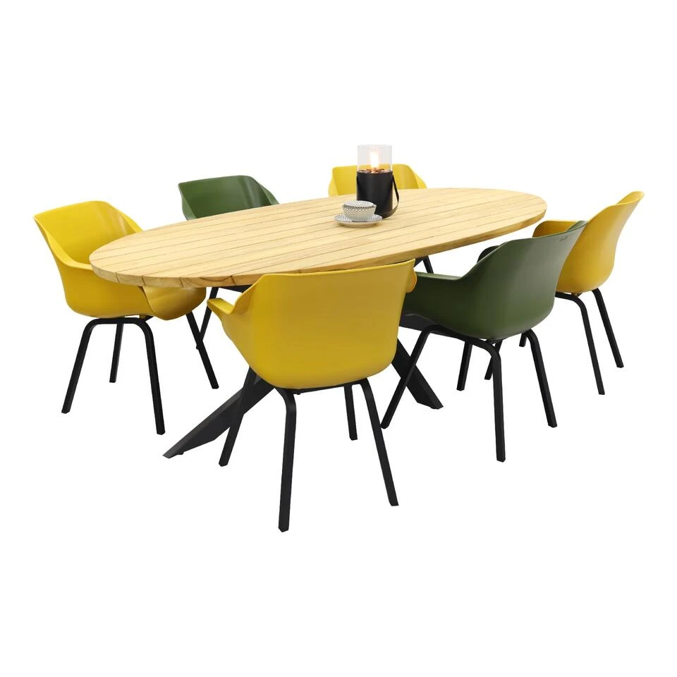 Zoek jij een tuinset voor 6 personen die kleur geeft aan jouw tuin? Dan hoef je niet meer verder te zoeken. Deze tuinset straalt gezelligheid uit door de combinatie van de gekleurde Hartman stoelen. De Sophie Element tuinstoelen zitten heerlijk comfortabel en worden bij deze set geleverd in twee trendy kleuren. Het geel en groen van de tuinstoelen past perfect bij het mooie teakhout van de Prado Ellips tuintafel. Door de ovale vorm van het tafelblad is deze tafel zelf ook al een eyecatcher. Met deze set haal je echt een showstopper in je tuin! Bestel snel online en zorg dat deze wow factor binnenkort in jouw tuin staat.