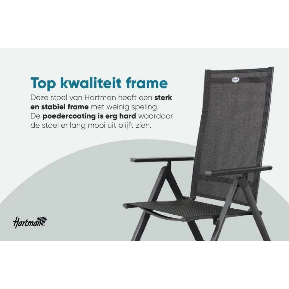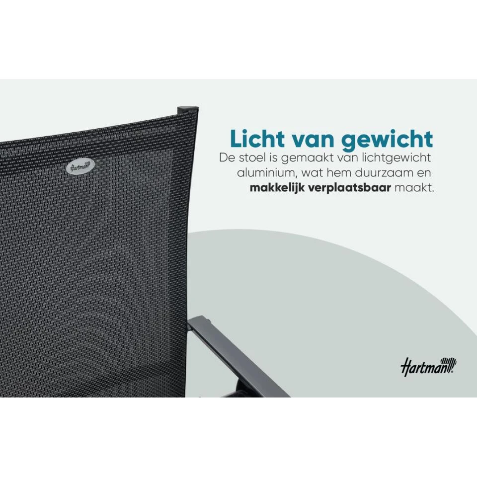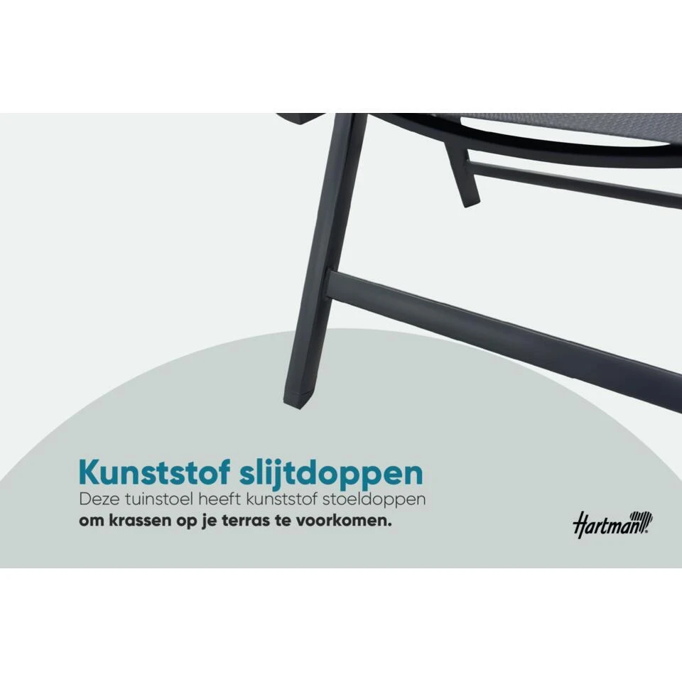 Dit is 6x de Napoli verstelbare tuinstoel van het bekende tuinmeubelmerk Hartman. De Napoli standenstoel is een perfect geschikt om heerlijk aan tafel te dineren maar, met de verstelbare rugleuning ook heerlijk om lekker te relaxen in je tuin of op je balkon. En doordat de stoel inklapbaar is, is deze makkelijk op te bergen!