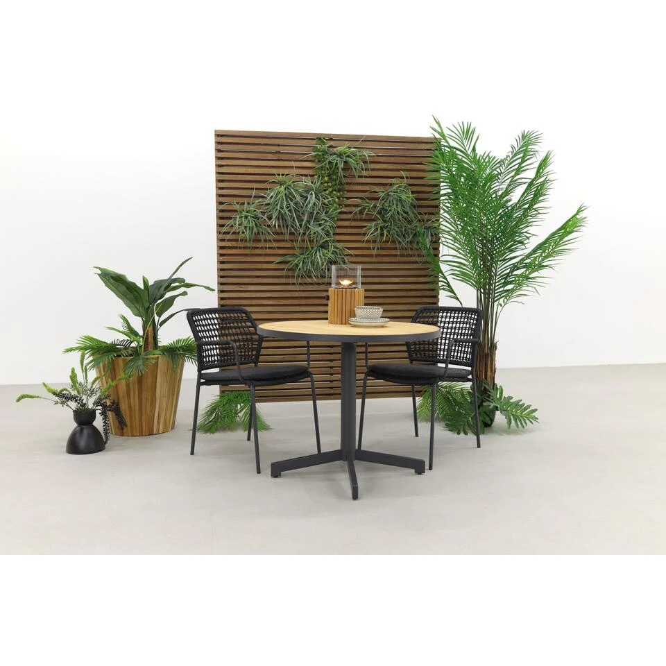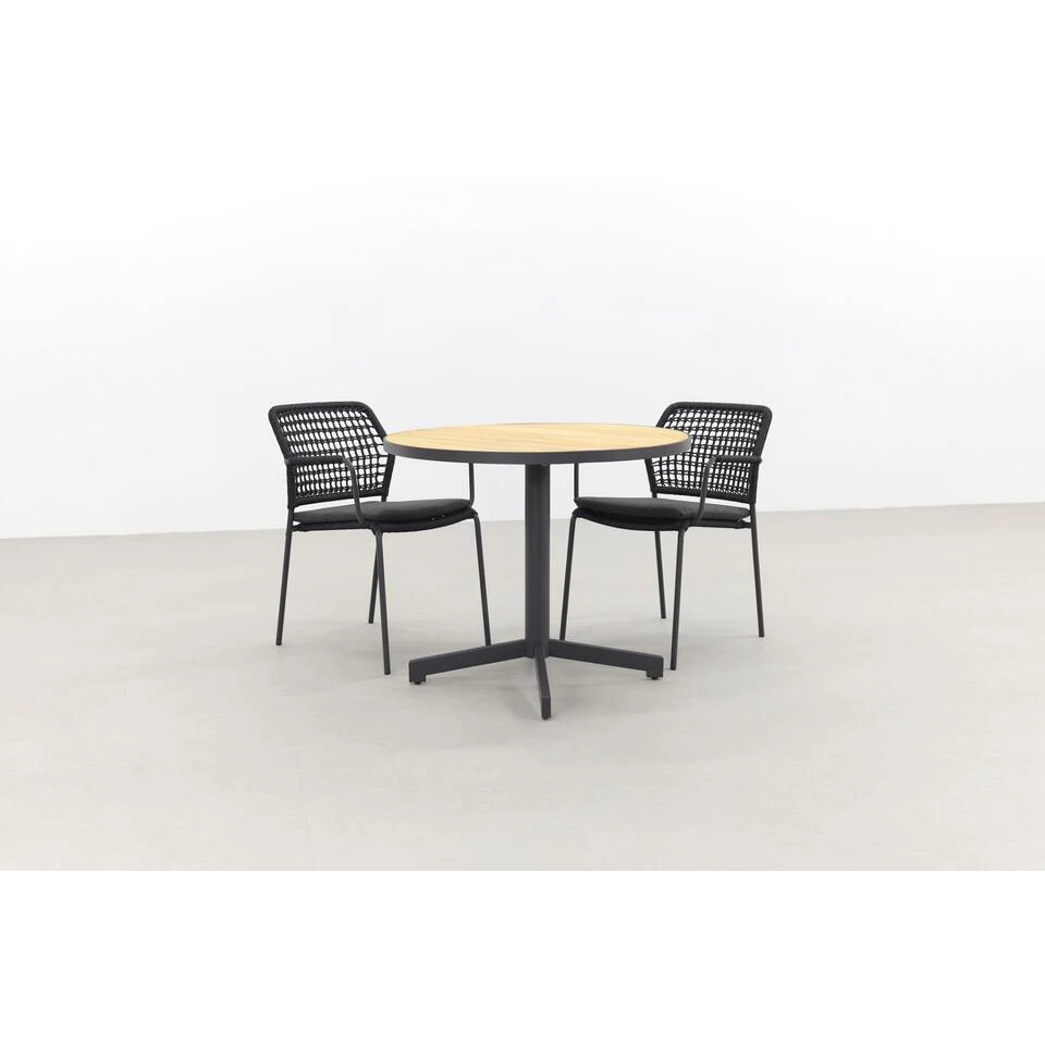 Ben jij op zoek naar een compacte tuinset met een stijlvolle uitstraling? Dan ben je met deze Barsita/Fiesta combinatie helemaal aan het juiste adres! De Barista tuinstoelen hebben een elgegant design, met een rope motief dat je nergens anders ziet! De Fieste tuintafel heeft een ronde vorm en een teakhouten tafelblad. Hiermee straalt de tuintafel veel warmte uit. Door het antracieten frame past dit perfect bij de antracieten kleuring van de stoelen. Door de meegeleverde kussens zit je ook nog eens heel erg comfortabel. Wat wil je nog meer? Bestel direct online en geniet zo snel mogelijk van deze eigentijdse tuinset!Â