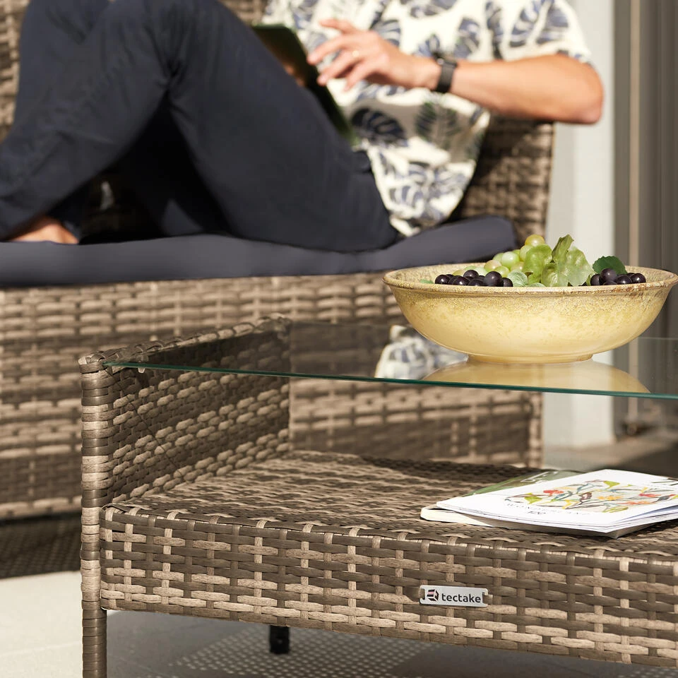 Chique, robuust en onderhoudsvriendelijk: de wicker tuinset van tectake combineert grote functionaliteit en hoog comfort. De twee stoelen en de zitbank met wicker weefsel van kunststof zijn ideaal geschikt voor gebruik in open lucht. De verwijderbare bekledingen zijn qua kleur perfect op het garnituur afgestemd en kunnen probleemloos met een vochtige doek worden gereinigd. De vlakke tafel met legvlak onder het verwisselbare blad van massief veiligheidsglas vormt het middelpunt van de meubelgroep. Geniet van mediterrane zomeravonden op uw terras of in uw tuin in de comfortabele wicker tuinset van tectake.