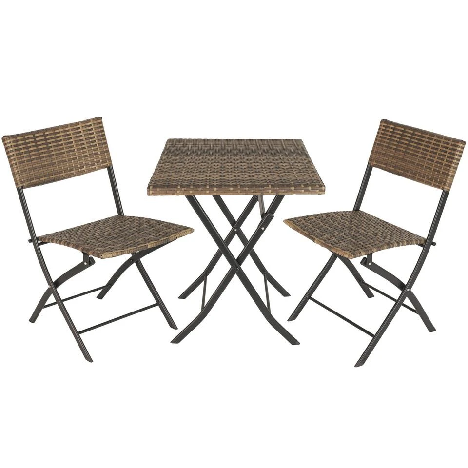 Deze driedelige ratanset van tectake overtuigt met een chique look, hoge flexibiliteit en veel gezelligheid. De compacte zitgarnituur is ideaal geschikt voor kleine balkons, terrassen of nissen. Indien niet in gebruik, kunnen de afzonderlijke elementen ruimtebesparend gevouwen worden. De tafel alsook de beide stoelen van gepoedercoat staal en het fijne vlechtwerk van duurzaam polyraten worden klaar gemonteerd geleverd. De combinatie van robuust frame en laag gewicht maken deze onderhoudsvriendelijke ratanset van tectake perfect voor transport en de camping.