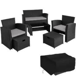 Deze uitnodigende wicker zitgroep van tectake combineert op geslaagde wijze chique design met veel comfort. De zachte zitkussens en de krukken als voetsteunen zorgen voor ontspannen momenten in de woonkamer in open lucht. Als ze niet worden gebruikt, kunnen de krukken gewoon onder de stoelen worden geschoven en de waterafstotende kussens handig in de bank worden opgeborgen. Door het hoogwaardige vlechtwerk van duurzaam wicker en het robuuste onderframe van staal overtuigt de onderhoudsvriendelijke wicker zitgroep van tectake ook met haar „innere waarden“.