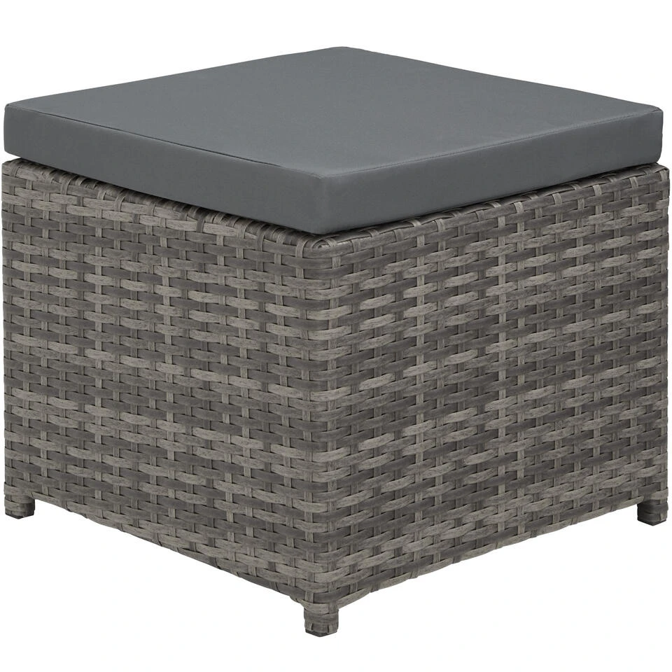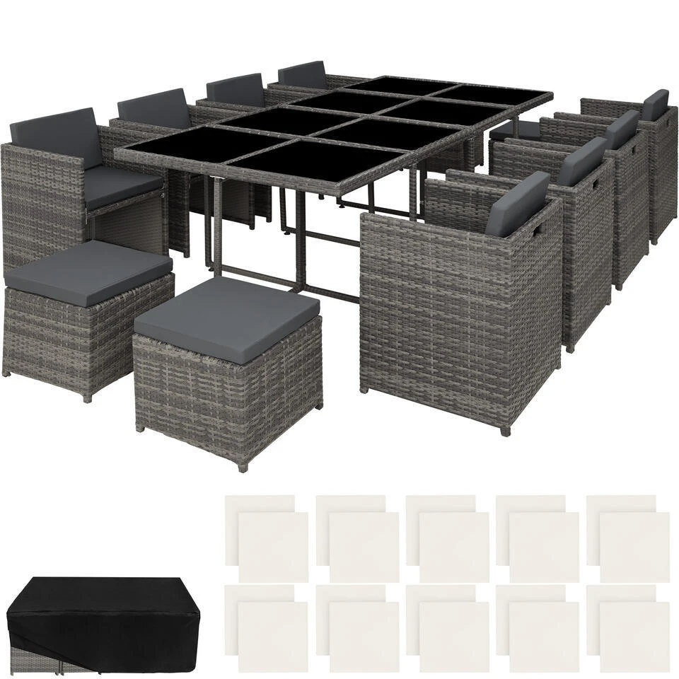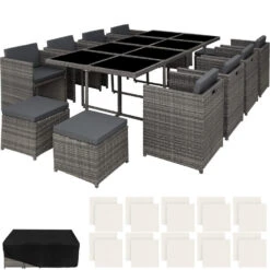 Met deze uitnodigende wicker zitgroep van tectake maak je heel wat indruk. Het ensemble in zijn puristisch, hoekig design biedt voldoende plaats en combineert gemoedelijkheid met gezelligheid. De qua kleur op elkaar afgestemde bekledingen van de zachte kussens zijn verwijderbaar en waterafstotend. Zowel de stoelen als de tafel zijn bijzonder stabiel en weerbestendig. Als ze niet worden gebruikt, kunnen de aparte elementen in het plaatsbesparende kubussysteem samengeschoven worden. Een meubelgarnituur dat het in zich heeft: De functionele wicker zitgroep van tectake.