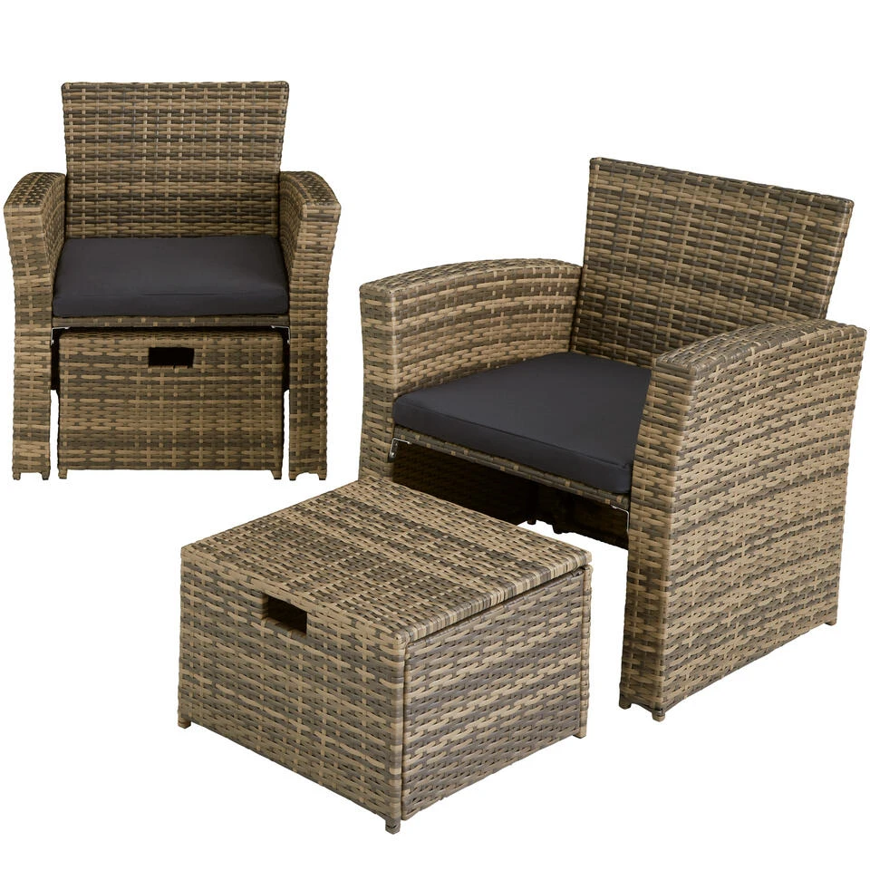 Deze uitnodigende wicker zitgroep van tectake combineert op geslaagde wijze chique design met veel comfort. De zachte zitkussens en de krukken als voetsteunen zorgen voor ontspannen momenten in de woonkamer in open lucht. Als ze niet worden gebruikt, kunnen de krukken gewoon onder de stoelen worden geschoven en de waterafstotende kussens handig in de bank worden opgeborgen. Door het hoogwaardige vlechtwerk van duurzaam wicker en het robuuste onderframe van staal overtuigt de onderhoudsvriendelijke wicker zitgroep van tectake ook met haar „innere waarden“.