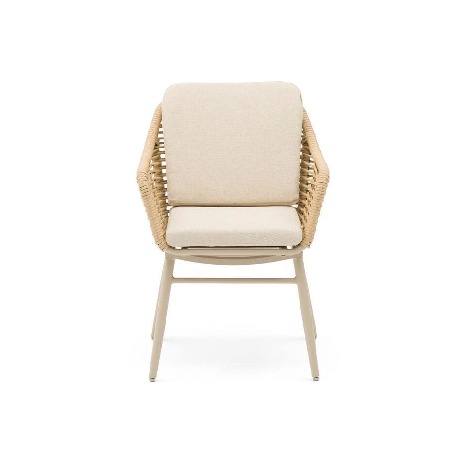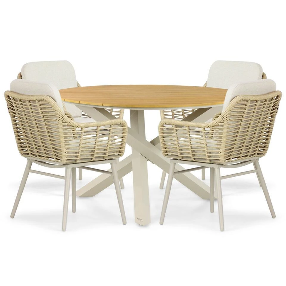 Coco Antoni/Ancona dining tuinset 5-delig De Coco Antoni/Ancona dining tuinset 5-delig is een stijlvolle en compacte keuze voor jouw tuin of terras. Deze moderne set bestaat uit de ronde Lifestyle Ancona dining tuintafel van 125 cm en vier comfortabele Coco Antoni diningstoelen. Dankzij het gebruik van duurzame materialen zoals aluminium, polywood en rope is deze tuinset onderhoudsvriendelijk, weerbestendig en een blikvanger in iedere buitenruimte. Kom deze prachtige tuinset zelf ervaren in een van onze 12 Tuinmeubelshop XXL Experience Stores! De Coco Antoni/Ancona dining tuinset 5-delig bestaat uit: * 4x Coco Antoni diningstoel * 1x Lifestyle Ancona dining tuintafel 125 cm rond Eigenschappen Coco Antoni diningstoel De Coco Antoni diningstoel combineert comfort met een strak en eigentijds ontwerp. Het frame van de stoel is gemaakt van aluminium, een lichtgewicht en roestbestendig materiaal dat ideaal is voor gebruik buitenshuis. De stoel is afgewerkt met rope, een sterk en flexibel materiaal dat zorgt voor een moderne en luxe uitstraling. De stoel is uitgevoerd in de kleur loft, een stijlvolle en tijdloze tint die perfect past bij diverse tuinstijlen. Dankzij de ergonomische vormgeving biedt de Coco Antoni diningstoel langdurig zitcomfort, ideaal voor gezellige diners of ontspannen momenten in de tuin. Het lichte gewicht maakt de stoelen eenvoudig te verplaatsen, terwijl de hoogwaardige materialen bestand zijn tegen diverse weersomstandigheden. Het moderne ontwerp van de Coco Antoni diningstoel sluit naadloos aan bij de Lifestyle Ancona dining tuintafel, wat zorgt voor een harmonieus geheel. Eigenschappen Lifestyle Ancona dining tuintafel 125 cm rond De Lifestyle Ancona dining tuintafel is een compacte en stijlvolle tafel die ideaal is voor kleinere buitenruimtes. Het onderstel is gemaakt van aluminium, wat zorgt voor een stevig en volledig roestbestendig frame. Het tafelblad is vervaardigd uit polywood, een onderhoudsvriendelijk materiaal dat de warme uitstraling van hout combineert met de voordelen van weerbestendigheid. Met een diameter van 125 cm biedt de tafel voldoende ruimte voor vier personen, perfect voor intieme diners of gezellige borrelmomenten. De ronde vorm creëert een uitnodigende sfeer en maakt het gemakkelijk om iedereen aan tafel te betrekken. Het moderne design van het aluminium onderstel en de natuurlijke uitstraling van het polywood tafelblad sluiten perfect aan bij de Coco Antoni diningstoelen, waardoor een elegante en praktische opstelling ontstaat.