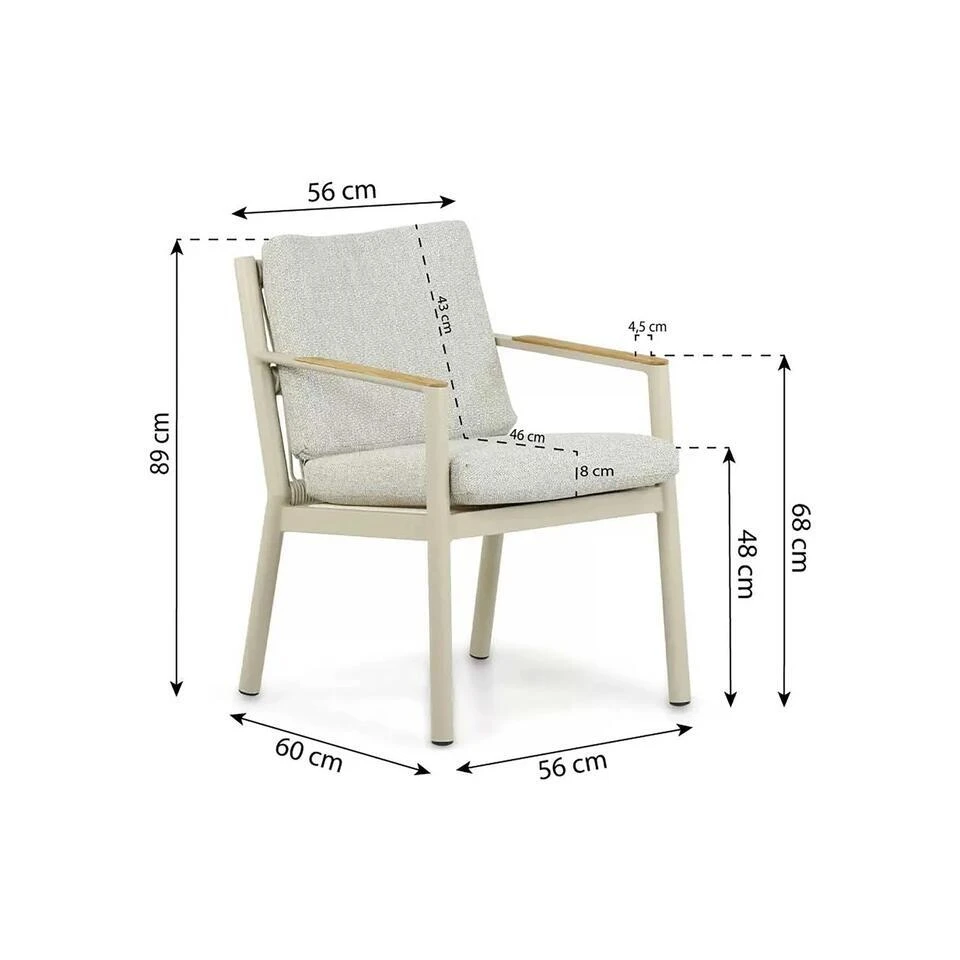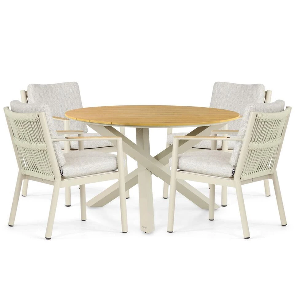 Coco Sevilla/Ancona dining tuinset 5-delig De Coco Sevilla/Ancona dining tuinset 5-delig is de perfecte keuze voor een stijlvolle en compacte opstelling in jouw tuin of op je terras. Deze moderne set bestaat uit de ronde Ancona dining tuintafel van 125 cm en vier comfortabele Coco Sevilla diningstoelen. Dankzij het gebruik van hoogwaardige materialen zoals aluminium, polywood en rope is deze set onderhoudsvriendelijk, weerbestendig en een echte blikvanger. Kom deze prachtige tuinset zelf ervaren in een van onze 12 Tuinmeubelshop XXL Experience Stores! De Coco Sevilla/Ancona dining tuinset 5-delig bestaat uit: * 4x Coco Sevilla diningstoel * 1x Ancona dining tuintafel 125 cm rond Eigenschappen Coco Sevilla diningstoel De Coco Sevilla diningstoel combineert modern design met comfort en gebruiksgemak. Het frame van de stoel is gemaakt van aluminium, een lichtgewicht en roestbestendig materiaal dat perfect is voor buitengebruik. Het zit- en ruggedeelte zijn vervaardigd uit rope, een sterk en flexibel materiaal dat zorgt voor een comfortabele en moderne uitstraling. De stoel is uitgevoerd in de kleur loft, wat zorgt voor een stijlvolle en eigentijdse uitstraling die in elke tuin past. De ergonomische vormgeving biedt optimaal zitcomfort, zelfs tijdens lange diners. Het lichte gewicht van de stoelen maakt ze eenvoudig te verplaatsen, en dankzij het gebruik van duurzame materialen zijn ze bestand tegen diverse weersomstandigheden. Het moderne ontwerp sluit perfect aan bij de strakke lijnen van de Ancona dining tuintafel, waardoor een harmonieus geheel ontstaat. Eigenschappen Lifestyle Ancona dining tuintafel 125 cm rond De Ancona dining tuintafel is een compacte en stijlvolle tafel die ideaal is voor kleinere buitenruimtes. Het onderstel is gemaakt van aluminium, wat zorgt voor een stevig en volledig roestbestendig frame. Het tafelblad is vervaardigd uit polywood, een onderhoudsvriendelijk materiaal met de uitstraling van hout. Dit maakt de tafel lichtgewicht, weerbestendig en eenvoudig schoon te maken. Met een diameter van 125 cm biedt de tafel voldoende ruimte voor vier personen, perfect voor intieme diners of gezellige borrelmomenten. De ronde vorm zorgt voor een uitnodigende sfeer en maakt het eenvoudig om iedereen aan tafel te betrekken. De strakke lijnen van het onderstel en de natuurlijke uitstraling van het polywood tafelblad sluiten naadloos aan bij de moderne uitstraling van de Coco Sevilla diningstoelen.