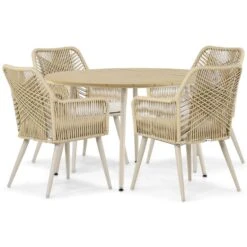 Coco Vedra/Matale 125 cm dining tuinset 5-delig Ben jij op zoek naar een compacte en stijlvolle tuinset die comfort en functionaliteit combineert? De Coco Vedra/Matale 125 cm dining tuinset is een prachtige keuze! Deze set bestaat uit vier Coco Vedra diningstoelen en een ronde Matale diningtafel van 125 cm. Met een modern design en hoogwaardige materialen is deze tuinset perfect voor jouw tuin, terras of balkon. Met de Coco Vedra/Matale 125 cm dining tuinset creëer je een sfeervolle en praktische buitenruimte waarin je jarenlang kunt genieten. Bestel de set eenvoudig online of bezoek één van de megastores van Tuinmeubelshop om deze prachtige tuinset zelf te ervaren. Wij staan klaar om je te helpen bij het maken van de perfecte keuze! De Coco Vedra/Matale 125 cm dining tuinset bestaat uit: * 4 x Coco Vedra diningstoel * 1 x Matale diningtafel Ø 125 cm Eigenschappen Coco Vedra dining tuinstoel De Coco Vedra diningstoel combineert een luchtig en modern design met ultiem zitcomfort. De stoel heeft een stevig aluminium frame in een stijlvolle loftkleur, afgewerkt met strak gespannen kunststof draad in een warme Sandkleur. Dit unieke ontwerp zorgt niet alleen voor een eigentijdse uitstraling, maar biedt ook uitstekend zitcomfort. Voor extra comfort wordt de stoel geleverd met een weerbestendig zitkussen in een lichte zandkleur. Dit kussen is vuil- en waterafstotend, zodat je het hele jaar door zorgeloos kunt genieten. De ergonomische vorm van de stoel maakt hem ideaal voor lange diners en ontspannen momenten in de buitenlucht. Dankzij de hoogwaardige materialen is de Vedra stoel volledig weerbestendig en eenvoudig te onderhouden. Het veelzijdige ontwerp maakt deze stoel perfect te combineren met de Matale diningtafel, maar ook geschikt voor andere tafels uit de collectie van Tuinmeubelshop. Eigenschappen Matale dining tuintafel Ø 125 cm De Matale diningtafel met een diameter van 125 cm is een stijlvolle en functionele toevoeging aan deze set. Het tafelblad is gemaakt van polywood, een duurzaam materiaal dat de uitstraling van hout combineert met onderhoudsvriendelijke eigenschappen. Polywood is krasbestendig en bestand tegen verschillende weersomstandigheden, wat het perfect maakt voor buitengebruik. Het pootstel is uitgevoerd in aluminium met een loftkleurige poedercoating, wat zorgt voor een strak en modern design. De ronde vorm van de tafel biedt een knusse en gezellige setting, ideaal voor vier personen. Dankzij de compacte afmetingen is de Matale diningtafel perfect voor kleinere buitenruimtes, zonder in te leveren op stijl of functionaliteit. De Matale tafel is leverbaar in diverse maten en kleuren.