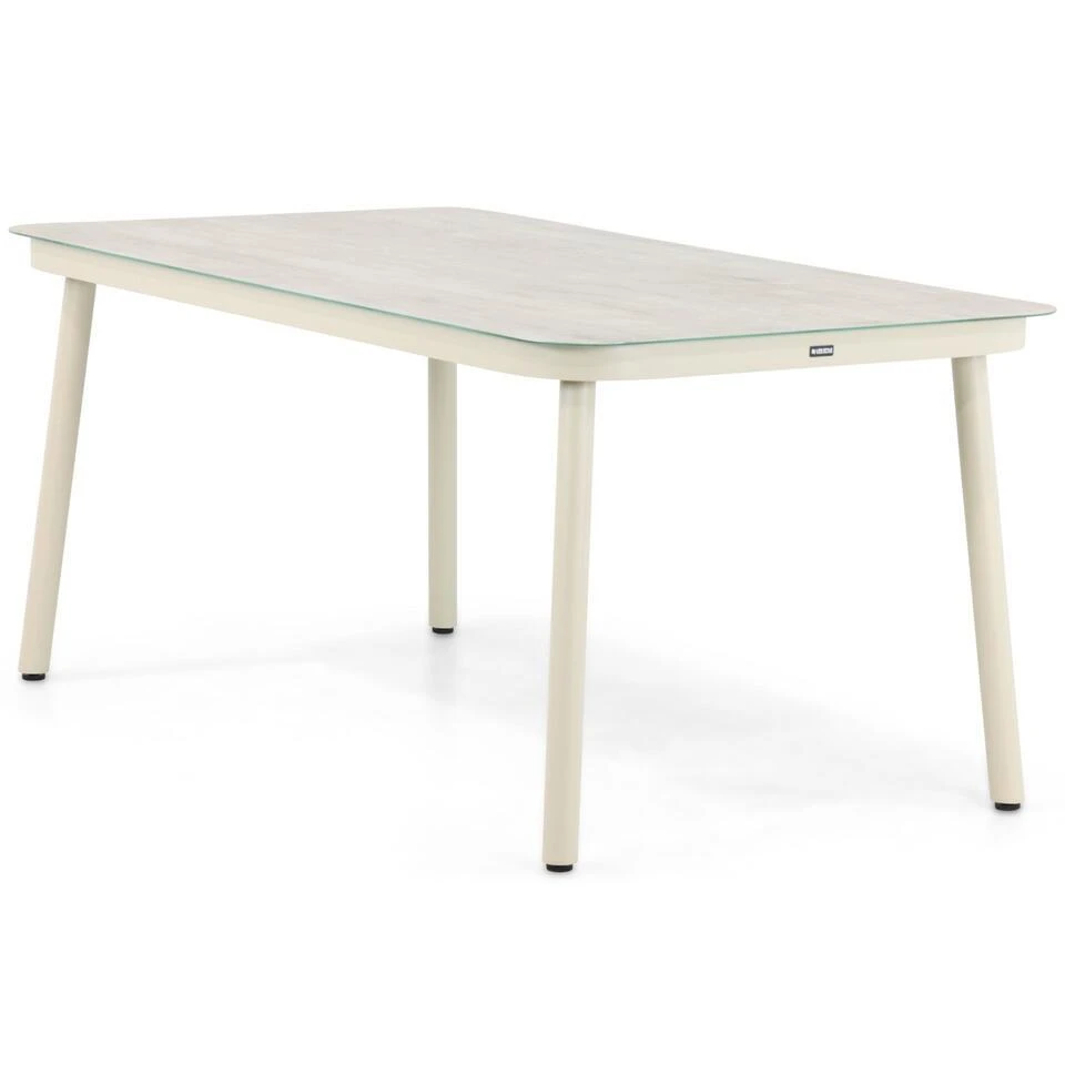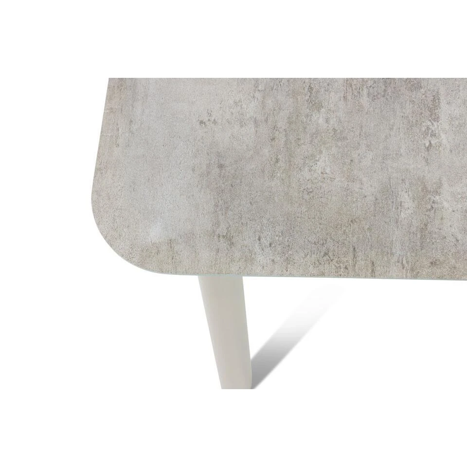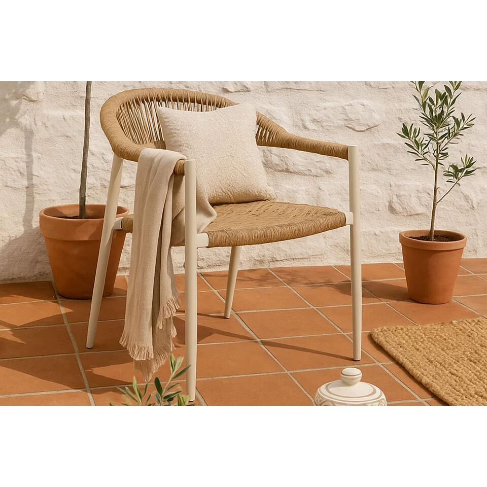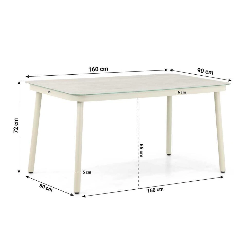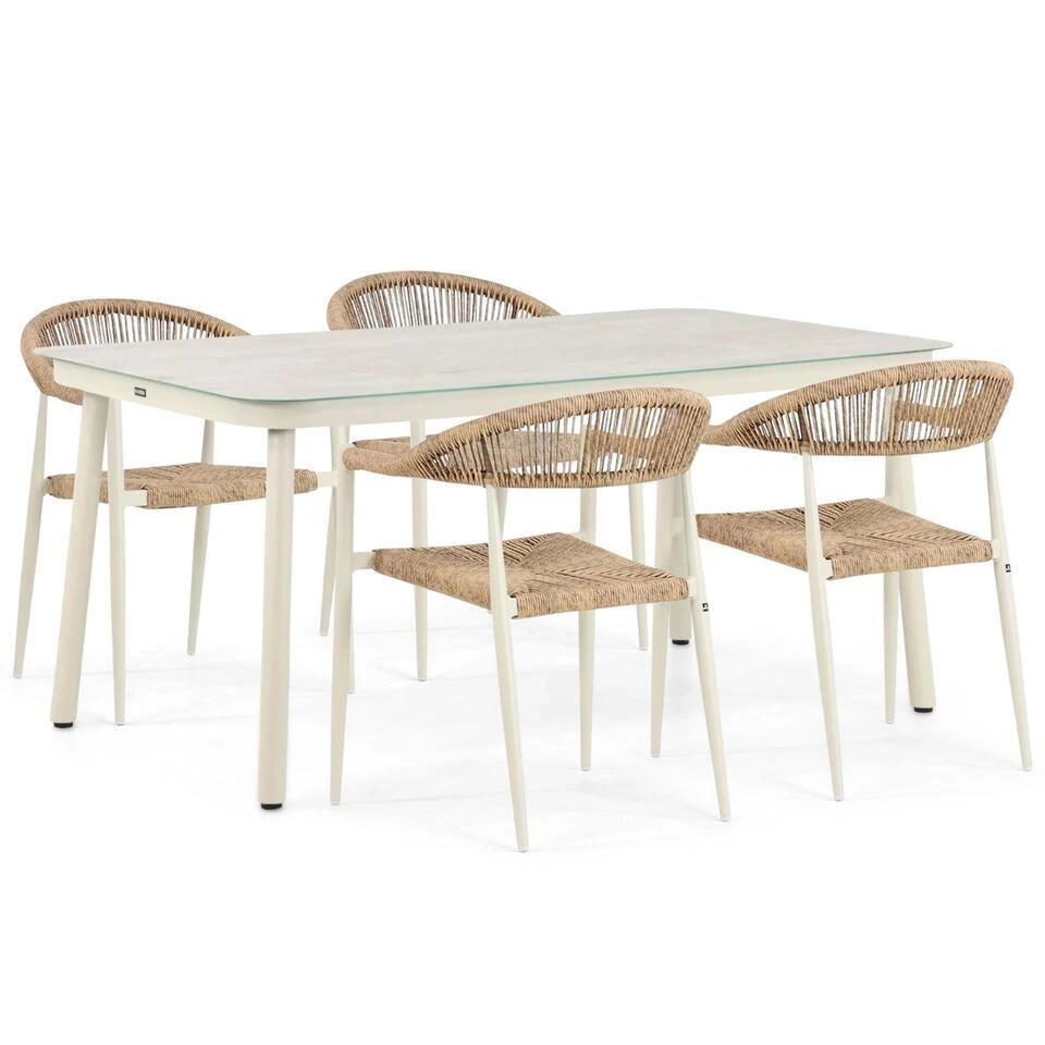 De Laan Granada/Tavano dining tuinset 5-delig De De Laan Granada/Tavano dining tuinset 5-delig is een stijlvolle en compacte keuze voor jouw tuin of terras. Deze moderne set bestaat uit de strakke Lifestyle Tavano dining tafel van 160 x 90 cm en vier comfortabele De Laan Granada diningstoelen. Door het gebruik van hoogwaardige materialen zoals aluminium, gehard glas, keramiek en rope is deze tuinset duurzaam, onderhoudsvriendelijk en volledig weerbestendig. Kom deze prachtige tuinset zelf ervaren in een van onze 12 Tuinmeubelshop XXL Experience Stores! De De Laan Granada/Tavano dining tuinset 5-delig bestaat uit: * 4x De Laan Granada diningstoel * 1x Lifestyle Tavano dining tafel 160 x 90 cm Eigenschappen De Laan Granada diningstoel De De Laan Granada diningstoel combineert modern design met comfort en duurzaamheid. Het frame van de stoel is gemaakt van aluminium, een lichtgewicht en roestbestendig materiaal dat ideaal is voor buitengebruik. De stoel is afgewerkt met rope, een flexibel en stevig materiaal dat zorgt voor een eigentijdse en luxe uitstraling. De stoel is uitgevoerd in de kleur loft, een stijlvolle en veelzijdige tint die moeiteloos aansluit bij verschillende tuinstijlen. Dankzij de ergonomische vormgeving biedt de Granada diningstoel langdurig zitcomfort, perfect voor gezellige diners of ontspannen momenten in de tuin. Het lichte gewicht maakt de stoel eenvoudig te verplaatsen, terwijl de gebruikte materialen bestand zijn tegen uiteenlopende weersomstandigheden. Het strakke ontwerp van de Granada diningstoel sluit naadloos aan bij de Lifestyle Tavano dining tafel, waardoor een harmonieus en elegant geheel ontstaat. Eigenschappen Lifestyle Tavano dining tafel 160 x 90 cm De Lifestyle Tavano dining tafel combineert een strak en functioneel ontwerp met hoogwaardige materialen. Het frame van de tafel is vervaardigd uit gepoedercoat aluminium, wat zorgt voor een stevige en volledig roestbestendige basis. Het tafelblad is gemaakt van gehard glas en afgewerkt met een keramische laag, die niet alleen zorgt voor een luxe uitstraling maar ook extra bescherming biedt tegen dagelijks gebruik. De tafel is uitgevoerd in de kleur loft, een tijdloze en elegante tint die perfect past bij de Granada diningstoelen. Met een afmeting van 160 x 90 cm biedt de tafel voldoende ruimte voor vier personen, ideaal voor intieme diners of gezellige borrelmomenten. Het moderne ontwerp van het aluminium frame en de luxe uitstraling van het keramische tafelblad maken deze tafel een stijlvolle aanvulling op de Granada diningstoelen, waardoor een praktische en elegante opstelling ontstaat.
