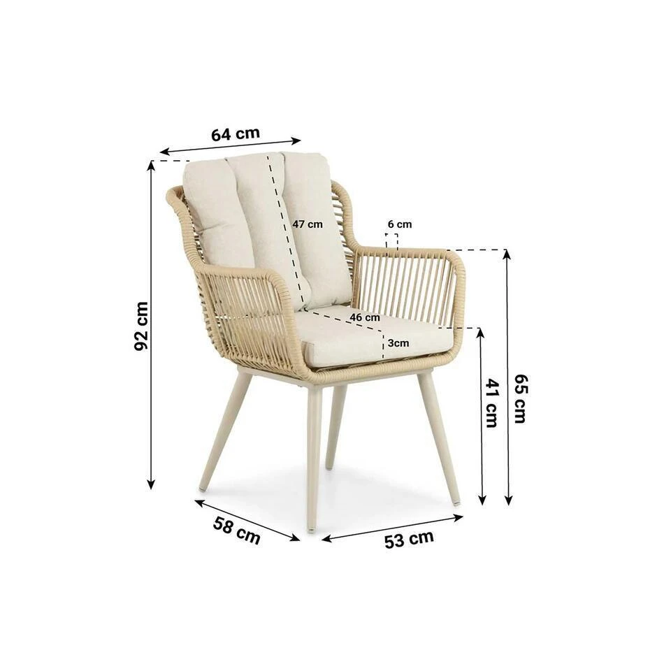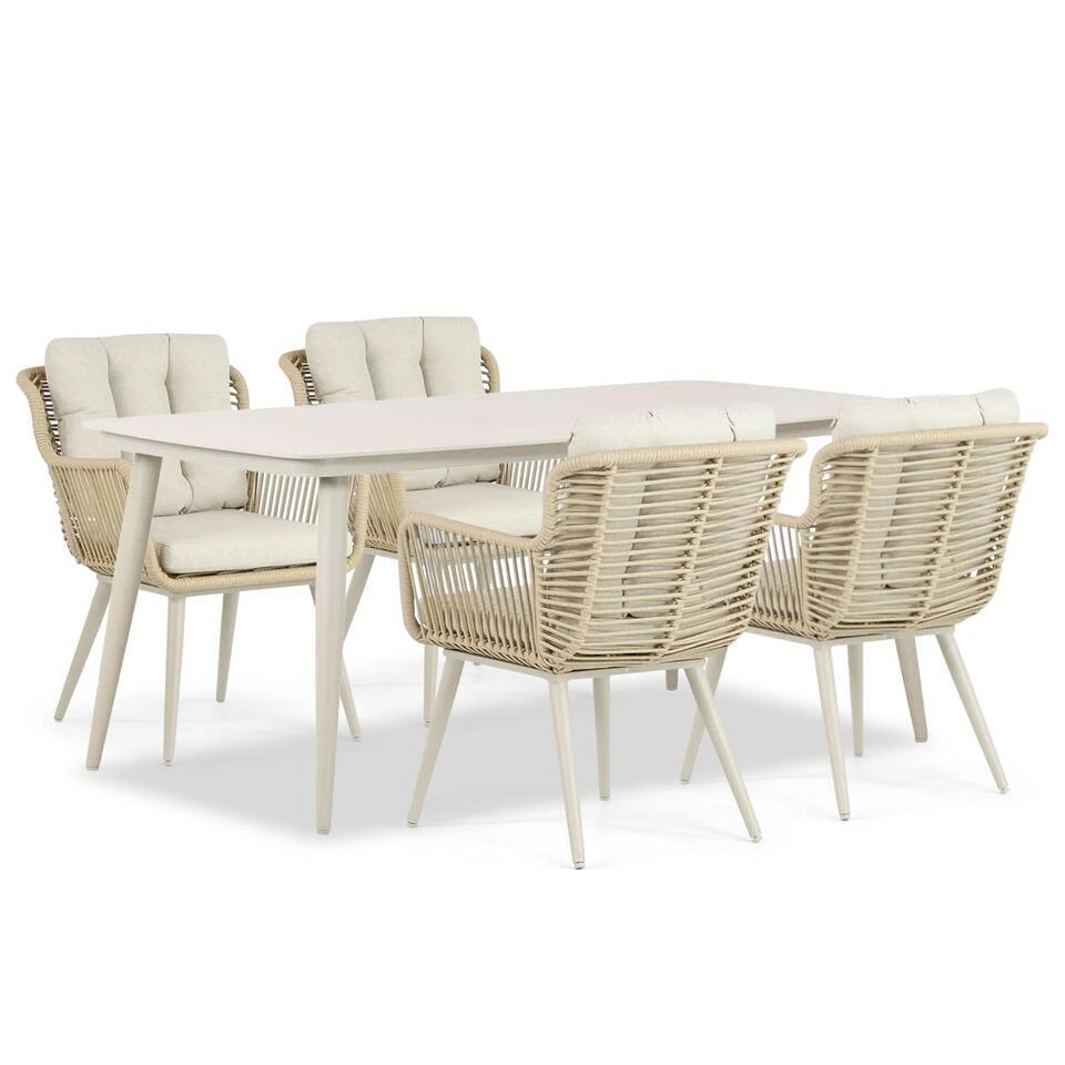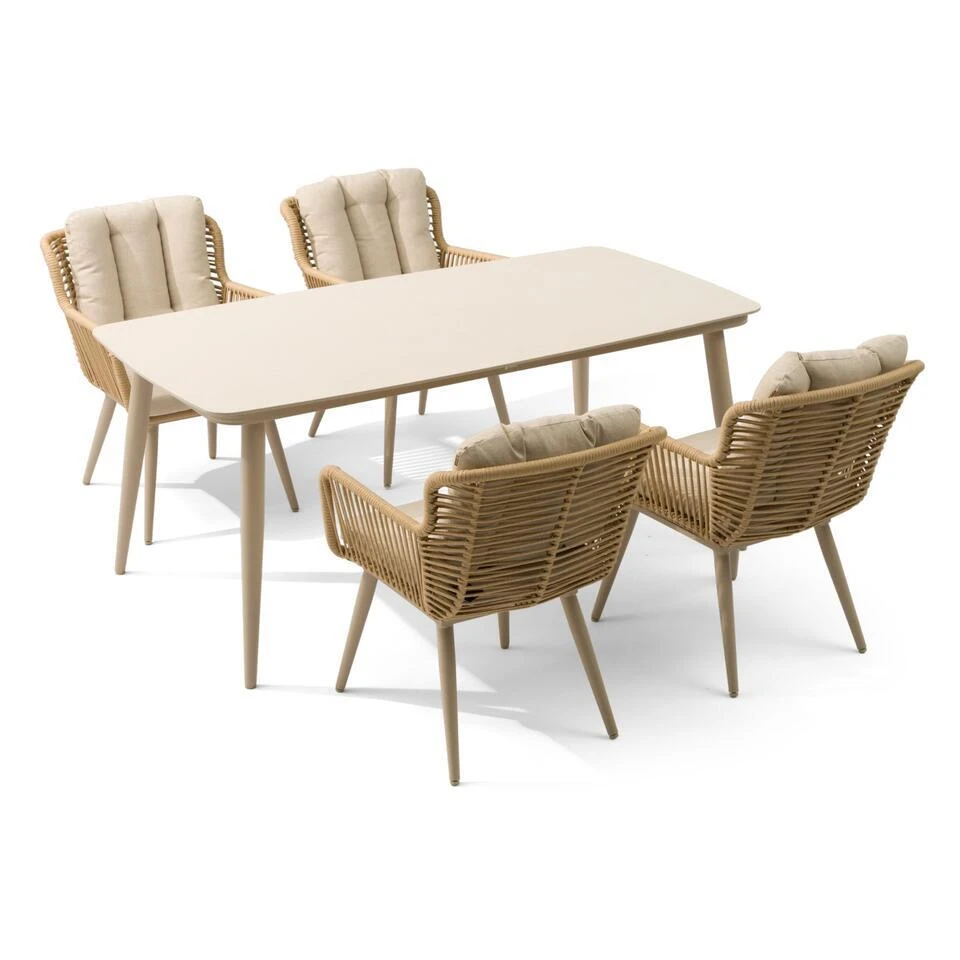 Coco Custa/Coco Vienna 180 cm sand dining tuinset 5-delig Creëer een stijlvolle en comfortabele eethoek in je tuin met de Coco Custa/Coco Vienna 180 cm sand dining tuinset. Deze 5-delige set combineert vier moderne Coco Custa dining stoelen in loft/sand-tinten met de ruime Coco Vienna dining tuintafel van 180 cm. De combinatie van warme kleuren, een strakke vormgeving en duurzame materialen maakt deze tuinset perfect voor lange, gezellige diners in de buitenlucht. Bezoek één van de 12 Tuinmeubelshop Experience Stores XXL en ontdek zelf het comfort en de kwaliteit van deze prachtige set! De Coco Custa/Coco Vienna 180 cm sand dining tuinset 5-delig bestaat uit: * 4 x Coco Custa dining stoel loft/sand * 1 x Coco Vienna dining tuintafel 180 x 90 cm sand Eigenschappen Coco Custa dining stoel De Coco Custa dining stoel combineert eigentijds design met ultiem zitcomfort. Het frame van de stoel is gemaakt van gepoedercoat aluminium, wat lichtgewicht, stevig en volledig weerbestendig is. De zitting en rugleuning zijn afgewerkt met rope in een warme sand-tint, wat de stoel een stijlvolle uitstraling geeft. De ergonomische vorm en de zachte zitkussens maken deze stoel ideaal voor lange diners. Door de neutrale kleuren sluit de Coco Custa dining stoel perfect aan bij de Coco Vienna tuintafel. Eigenschappen Coco Vienna dining tuintafel 180 cm sand De Coco Vienna dining tuintafel 180 cm sand biedt een ruime en praktische eettafeloplossing voor vier tot zes personen. Het tafelblad is gemaakt van polywood, een duurzaam materiaal dat de uitstraling van hout combineert met onderhoudsvriendelijkheid. Het aluminium frame is voorzien van een sterke poedercoating, waardoor de tafel volledig bestand is tegen weersinvloeden. De warme sandkleur en strakke lijnen maken de tafel een stijlvolle en tijdloze keuze die perfect past bij de Coco Custa dining stoelen. Met de Coco Custa/Coco Vienna 180 cm sand dining tuinset 5-delig haal je een comfortabele en elegante set in huis die jarenlang meegaat. Wil je deze set zelf ervaren? Bezoek één van onze megastores of neem contact met ons op. Onze deskundige medewerkers staan voor je klaar!