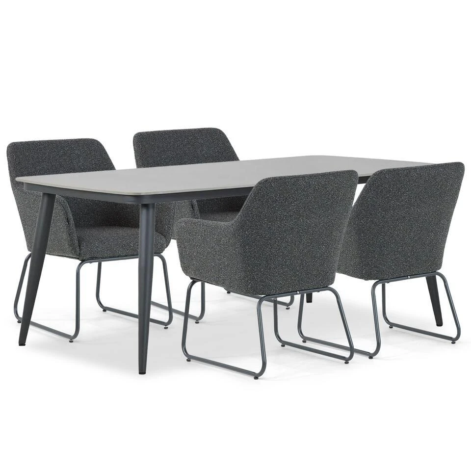 Lifestyle Lugo/Vienna 180 cm dining tuinset 5-delig De Lifestyle Lugo dining set, gecombineerd met de ruime Coco Vienna diningtafel van 180 cm, biedt een moderne en comfortabele eetopstelling voor jouw tuin of terras. Met vier hoogwaardige stoelen en een tafel van 180 cm is deze set perfect voor gezellige diners met familie of vrienden. Het gebruik van aluminium en olefin met quick dry foam garandeert duurzaamheid en een luxe uitstraling. Kom proefzitten in één van onze 12 Tuinmeubelshop Experience Stores XXL en ontdek hoe deze set jouw buitenruimte transformeert! De set bestaat uit: * 4 x Lifestyle Lugo diningstoel charcoal * 1 x Coco Vienna diningtafel 180 cm antraciet Eigenschappen Lifestyle Lugo diningstoel De Lifestyle Lugo diningstoel combineert moderne stijl met ultiem comfort. * Aluminium frame: Het gepoedercoate aluminium frame is lichtgewicht, sterk en volledig bestand tegen alle weersomstandigheden. Dit maakt de stoel duurzaam en gemakkelijk te verplaatsen. * Olefin stof met quick dry foam: De zitting en rugleuning zijn bekleed met luxe olefin-stof, die vuil- en waterafstotend is en bestand tegen verkleuring door de zon. De quick dry foam-vulling zorgt ervoor dat de stoel snel droogt na een regenbui, zodat je snel weer kunt genieten. * Tijdloos design: De charcoal-kleur en strakke lijnen maken deze stoel een stijlvolle keuze die perfect combineert met de Coco Vienna tafel. Eigenschappen Coco Vienna diningtafel 180 cm antraciet De Coco Vienna diningtafel biedt een ruime en stijlvolle basis voor jouw buitenruimte. * Rechthoekig design: Met een lengte van 180 cm is de tafel ideaal voor vier tot zes personen, waardoor je volop ruimte hebt voor gezellige diners. * Aluminium frame: Het gepoedercoate aluminium frame is sterk, lichtgewicht en volledig weerbestendig. * Keramisch tafelblad: Het krasbestendige en hittebestendige keramische tafelblad is gemakkelijk schoon te maken en geeft de tafel een luxe uitstraling. * Strakke en moderne uitstraling: De antracietkleur en het minimalistische ontwerp maken de tafel een perfecte match met de Lifestyle Lugo stoelen. Met deze set haal je een onderhoudsvriendelijke en duurzame dining set in huis. Dankzij de quick dry foam-kussens, de olefin-stof en het weerbestendige aluminium kun je jarenlang genieten van comfort en stijl in jouw buitenruimte. Bezoek één van onze showrooms en laat je inspireren door deze luxe dining set. Onze deskundige verkoopadviseurs helpen je graag bij het samenstellen van jouw ideale tuinmeubelen!