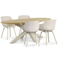 Lifestyle Salina/Brookline 200 cm dining tuinset 5-delig De Lifestyle Brookline dining tuintafel 200 cm in combinatie met de Lifestyle Salina dining tuinstoelen is een stijlvolle en praktische keuze voor jouw tuin of terras. Met voldoende ruimte voor vier personen nodigt deze set uit tot gezellige diners en ontspannen momenten buiten. De moderne uitstraling van de tuintafel en de comfortabele stoelen zorgen samen voor een luxe sfeer in jouw buitenruimte. Gemaakt van duurzame en weerbestendige materialen, is deze set ideaal voor jarenlang gebruik. Kom proefzitten en ervaar het zelf in één van onze 12 Tuinmeubelshop Experience Stores. De Lifestyle Salina/Brookline 200 cm dining tuinset 5-delig bestaat uit: * 1 x Lifestyle Brookline dining tuintafel 200 cm * 4 x Lifestyle Salina dining tuinstoel loft Eigenschappen Lifestyle Brookline dining tuintafel 200×110 cm De Lifestyle Brookline dining tuintafel bestaat uit een hoogwaardig teakhouten tafelblad en een aluminium pootstel. Teakhout is een duurzame houtsoort met een natuurlijk hoog oliegehalte. Hierdoor is het hout uitstekend geschikt voor buitengebruik. Teakhout heeft een fijne structuur waardoor het hout fijn aanvoelt. Het hout gaat na verloop van tijd vergrijzen, wat de tafel een unieke en stoere uitstraling geeft. Ook kunnen er houtscheurtjes ontstaan. Het hout is ook bruin te behouden door het tafelblad te behandelen met Garden Collections Teak Protector. Het pootstel van de Lifestyle Bradford dining tuintafel is gemaakt van hoogwaardig aluminum. Aluminium heeft als voordelen dat het sterk en licht van gewicht is, en geen onderhoud nodig heeft. Bovendien is het aluminium voorzien van een poedercoating. Dit is een extra coating op het aluminium wat het materiaal een extra beschermlaag geeft. De Lifestyle Brookline dining tuintafel kan het gehele jaar door buiten blijven staan. Eigenschappen Lifestyle Salina dining tuinstoel De Lifestyle Salina dining tuinstoel is gemaakt van hoogwaardig kunststof. Het pootstel van de tuinstoel is volledig van gepoedercoat aluminium gemaakt. De Lifestyle Salina dining tuinstoel is daarmee bijzonder weerbestendig. De tuinstoel is heel makkelijk te verplaatsen doordat hij licht van gewicht is. Onder de pootjes zit een kunststof slijtdop. De Lifestyle Salina dining tuinstoel is bijzonder makkelijk in onderhoud: een vochtige doek erover en de tuinstoel is weer klaar om in te zitten! Benieuwd naar de mogelijkheden binnen de Tuinmeubelshop collectie of wil je de Lifestyle Salina dining tuinstoel combineren met een tuintafel? Bekijk het complete assortiment online, of neem contact met ons op. Wij adviseren je graag!