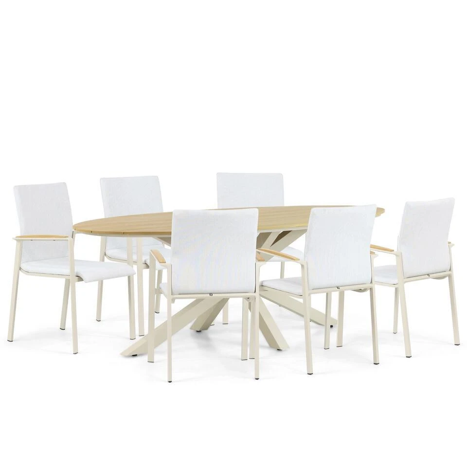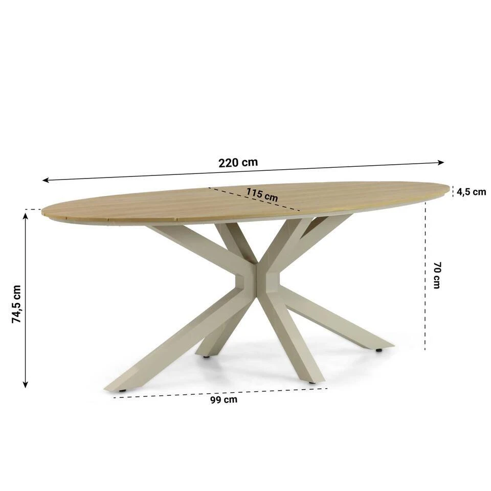 Lifestyle Brandon/Matara 220 cm dining tuinset 7-delig De Lifestyle Brandon/Matara 220 cm dining tuinset 7-delig is een stijlvol en praktisch tuinset, ideaal voor wie op zoek is naar comfort en duurzaamheid. Het set bestaat uit 6 Lifestyle Brandon dining tuinstoelen en 1 Lifestyle Matara dining tuintafel (220 x 115 cm). * 6 x Lifestyle Brandon dining tuinstoelen * 1 x Lifestyle Matara dining tuintafel Eigenschappen Lifestyle Brandon dining tuinstoelen De Lifestyle Brandon dining tuinstoel antraciet is gemaakt van duurzame materialen. Het frame van de tuinstoel is gemaakt van hoogwaardig aluminium. De grote voordelen van aluminium zijn de sterkte, de weersbestendigheid en het lage gewicht. Daarbij is het aluminium voorzien van een sterke poedercoating, waardoor de tuinstoel een extra bescherming heeft. De Brandon dining is omtrokken met een dubbele textileen laag. Dit zorgt voor een extra goed zitcomfort. Textileen is een fijn gevlochten kunstof wat flexibel is. Het vormt mee met je lichaam. De armleuning van de tuinstoel is van duurzaam teakhout. Je kunt ervoor kiezen om het hout op de natuurlijke manier te laten vergrijzen of om het hout bruin te houden. Om het hout bruin te houden adviseren wij om de armleuningen te behandelen met Garden Collections Teak protector. De Brandon dining tuinstoel kan het gehele jaar door buiten blijven staan en is eenvoudig te reiningen met een mild sopje. EigenschappenLifestyle Matara dining tuintafel De Lifestyle Matara dining tuintafel heeft een aluminium pootstel met een polywood tafelblad. Het aluminium pootstel is gepoedercoat in de kleur antraciet. Het poedercoaten is een elektrostatisch proces, waarbij poeder op het aluminium wordt aangebracht. Dit wordt verhit in een oven. Tijdens het uitharden worden de poederdeeltjes door de warmte eerst vloeibaar, vervolgens stroperig en tenslotte uitgehard tot een mooie en zeer duurzame coating op het frame van de tuintafel. Het materiaal aluminium is enorm populair in de tuinmeubelwereld. Aluminium is licht van gewicht en kan niet roesten, waardoor het een uitstekend materiaal is voor tuinmeubelen. Het tafelblad van de Lifestyle Matara tuintafel is van polywood. Polywood is een samenstelling van kunststoffen, dit is licht van gewicht en weerbestendig. Het tafelblad is bovendien voorzien van een houtstructuur, zodat je de look en feel van een houten tafelblad krijgt. De Lifestyle Matara dining tuintafel is geschikt om het hele jaar door buiten te blijven staan. De tuintafel kan met een mild schoonmaakmiddel gereinigd worden.