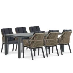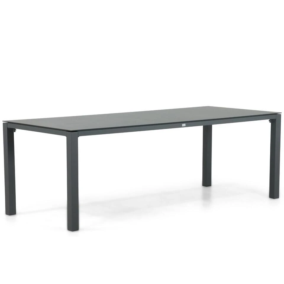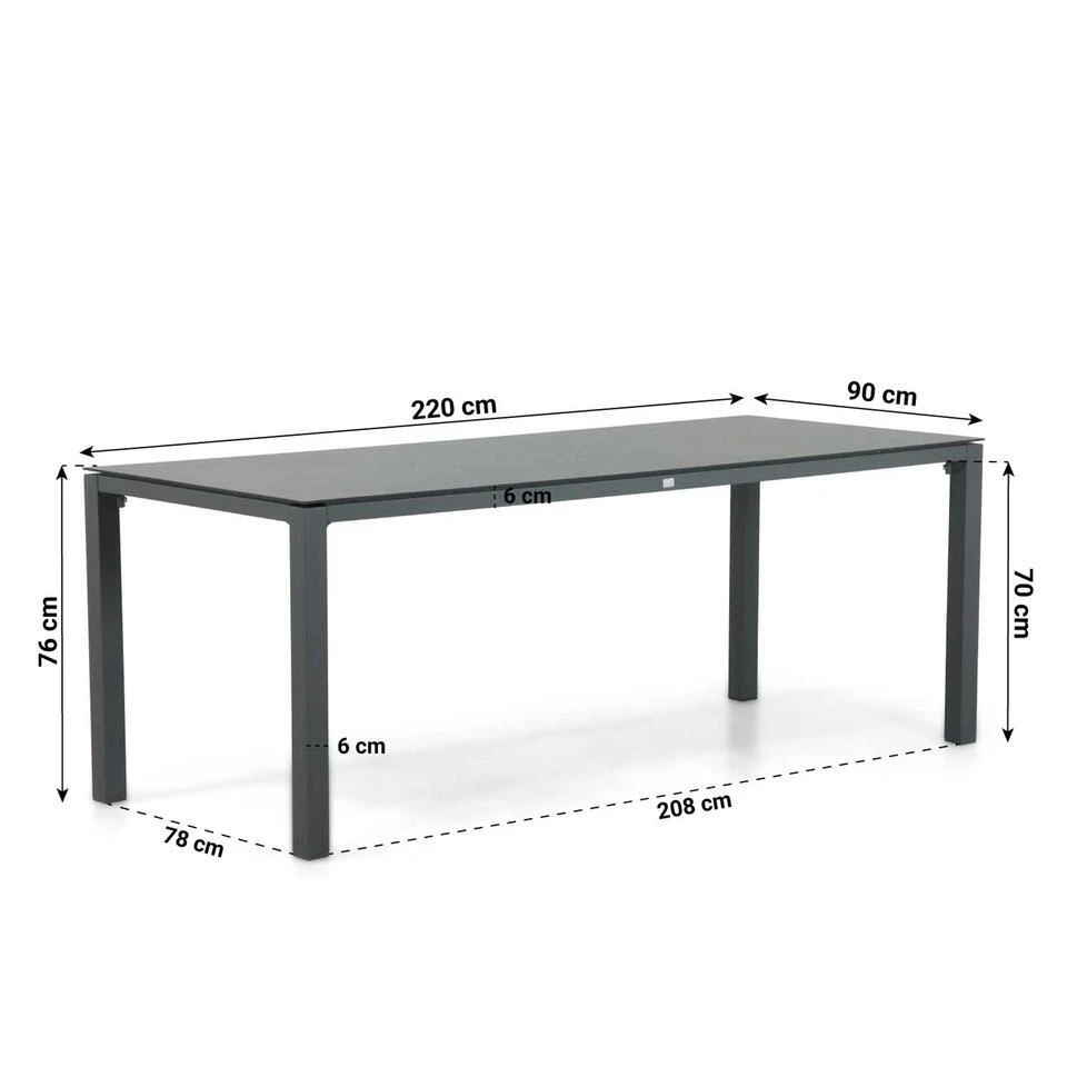 Lifestyle Salina/Mateo dining tuinset 7-delig Geef jouw tuin een moderne en stijlvolle uitstraling met de Lifestyle Salina diningstoelen en de royale Mateo dining tuintafel van 220 x 90 cm. Deze ruime tuinset biedt plaats aan zes personen en is perfect voor gezellige diners en lange zomeravonden in de buitenlucht. De Mateo dining tuintafel, met zijn stevige aluminium frame en krasbestendig HPL-tafelblad, combineert functionaliteit en elegantie. De Lifestyle Salina diningstoelen, gemaakt van aluminium en kunststof, voegen een eigentijdse uitstraling en hoog zitcomfort toe aan de set. Kom deze luxe tuinset zelf ervaren in een van onze 12 Tuinmeubelshop XXL Experience Stores! De Lifestyle Salina/Mateo dining tuinset 7-delig bestaat uit: * 6 x Lifestyle Salina diningstoel antraciet * 1 x Mateo dining tuintafel 220 x 90 cm Eigenschappen Lifestyle Salina diningstoel De Lifestyle Salina diningstoel combineert een strak ontwerp met hoogwaardige materialen. Het frame van de stoel is vervaardigd uit gepoedercoat aluminium, een lichtgewicht en roestbestendig materiaal dat perfect is voor gebruik buitenshuis. De zitting en rugleuning zijn gemaakt van hoogwaardig kunststof, dat duurzaam, weerbestendig en eenvoudig te reinigen is. De combinatie van aluminium en kunststof maakt de Salina diningstoelen niet alleen praktisch, maar ook stijlvol. De antracietkleurige afwerking geeft de stoelen een tijdloze uitstraling die naadloos aansluit bij de strakke lijnen van de Mateo dining tuintafel. Deze stoelen bieden optimaal zitcomfort, zodat je urenlang kunt genieten van een diner in de buitenlucht. Eigenschappen Mateo dining tuintafel 220 x 90 cm De Mateo dining tuintafel is een ruime en moderne tafel die ideaal is voor gebruik buitenshuis. Het frame is gemaakt van gepoedercoat aluminium, wat zorgt voor een stevige en roestbestendige constructie. Het tafelblad is vervaardigd uit HPL (High Pressure Laminate), een luxe materiaal dat kras- en hittebestendig is en eenvoudig te reinigen. Met een royale afmeting van 220 x 90 cm biedt de Mateo tafel voldoende ruimte voor zes personen, perfect voor etentjes, borrels of gezellige momenten. Het minimalistische ontwerp en de hoogwaardige afwerking maken de tafel een stijlvolle toevoeging aan elke tuin of terras.