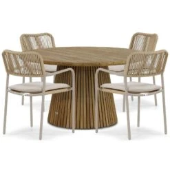 Coco Penya/Fungo 140 cm dining tuinset 5-delig Een tuinset met een natuurlijke look en een geweldig zitcomfort: de Coco Penya dining tuinstoel in combinatie met de Coco Fungo dining tuintafel 140 cm wat voor jou. De Coco Penya dining tuinstoel, in de kleur sand, is stapelbaar en eenvoudig schoon te maken. De Coco Fungo dining tuintafel 140 cm is gemaakt van teakhout en past in iedere achtertuin. De Coco Penya/Fungo 140 cm dining tuinset heeft plaats voor 4 personen. Je kunt ook jouw eigen tuinset samenstellen uit onze grote collectie tuinmeubelen. Neem gerust contact met ons op of kom eens langs in één van onze megastores. Wij adviseren je graag! De Coco Penya/Fungo 140 cm dining tuinset 5-delig bestaat uit: * 4 x Coco Penya dining tuinstoel * 1 x Coco Fungo dining tuintafel 140 cm Eigenschappen Coco Penya dining tuinstoel De Coco Penya dining tuinstoel, in de kleur sand, is gemaakt van volledig weerbestendige materialen. De tuinstoel is gemaakt van hoogwaardig aluminium. Aluminium heeft als grote voordelen dat het sterk en licht van gewicht is en geen onderhoud nodig heeft. Daarnaast is het aluminium voorzien van een duurzame poedercoating, waardoor het materiaal een extra bescherming heeft. De tuinstoel is bekleed met rope. Rope is van origine touw wat bergbeklimmers gebruiken. Dit is een zeer sterke, rekbare en weerbestendige draad. De Coco Penya dining tuinstoel is stapelbaar, dus eenvoudig op te bergen. De tuinstoel is eenvoudig te reinigen met een mild sopje. Onder de tuinstoelen zijn kunststof slijtdoppen aangebracht die eventuele beschadigingen aan de tuinstoel of het terras voorkomen. De Coco Penya dining tuinstoel is ook beschikbaar in de kleuren naturel en antraciet. Eigenschappen Coco Fungo dining tuintafel 140 cm De Coco Fungo dining tuintafel 140 cm is een stoere teakhouten tuintafel uit de collectie van Tuinmeubelshop. Het dikke tafelblad en robuuste frame maken dit tot een parel van een tuintafel. De tuintafel heeft een origineel pootstel dat voor een unieke uitstraling zorgt. De tuintafel is gemaakt van duurzaam teakhout afkomstig van gecertificeerde plantages uit Indonesië. De tuintafel is voorzien van het Indonesian Legal Wood® label, wat betekent dat het teakhout een duurzame afkomst heeft. De Coco Fungo dining tuintafel 140 cm is een royale 4-persoons tuintafel. Het teakhout is behandeld met een Old Teak Greywash finish, wat de tuintafel een stoere en tijdloze uitstraling geeft. De stoere uitstraling van deze tuintafel uit zich na verloop van tijd in de natuurlijke werking van het teakhout, zoals kleine haarscheurtjes en vergrijzing. Je kunt ervoor kiezen om de tuintafel volledig te laten vergrijzen of om de kleur te behouden zoals de tuintafel uit de verpakking komt. Hiervoor zijn de speciaal ontwikkelde Garden Collections onderhoudsproducten beschikbaar. De Coco Fungo tuintafel is voorzien van een stevig pootstel, wat ervoor zorgt dat de tuintafel altijd stabiel staat. Het is mogelijk om de tuintafel het hele jaar buiten te laten staan. Wij adviseren je om de teakhouten tuinmeubelen niet af te dekken met een afdekhoes. De Coco Fungo dining tuintafel is ook beschikbaar in de maat 180 cm.