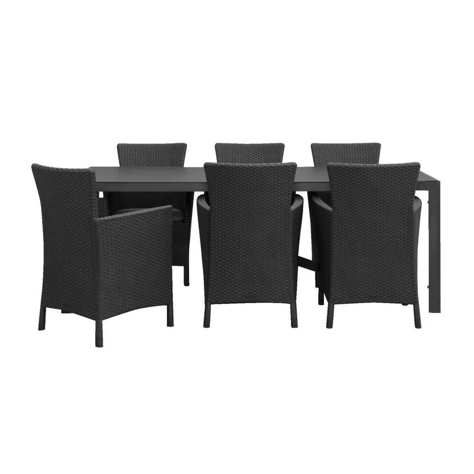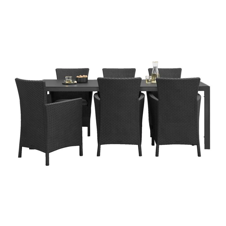 De tuinset Savoie Iowa is gemaakt van een aluminium frame met kunststof afwerking. De set bestaat uit 6 Iowa tuinstoelen met kussen en een prachtige Savoie tuintafel met glazen tafelblad. De combinatie van deze materialen geeft de gehele set een moderne uitstraling. De set is geschikt voor 6 personen.