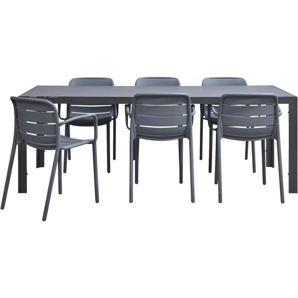 Tuinset Savoie Nice bestaat uit 6 tuinstoelen en een bijpassende tuintafel met glazen tafelblad. Zo weet je zeker dat de stoelen fijn aansluiten op de tafelhoogte. De set is verder gemaakt van aluminium en kunststof. Dat wil zeggen dat het relatief goed weerbestendig is. Daarnaast zorgen deze materialen, in combinatie met de kleur antraciet, voor een moderne en tijdloze uitstraling. De stoelen hebben geen tuinkussens inbegrepen, die zul je dus nog even los moeten uitzoeken. De tafel is 215 cm lang en dat maakt deze set geschikt voor 6 personen.