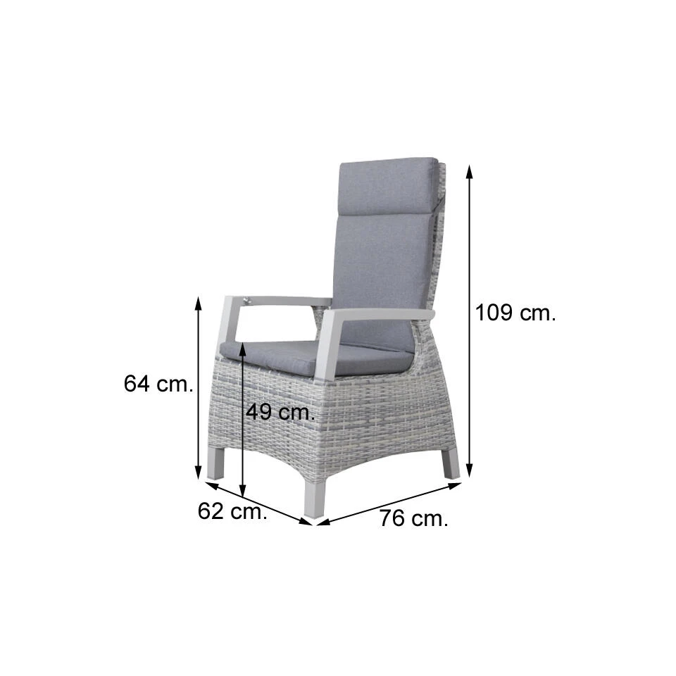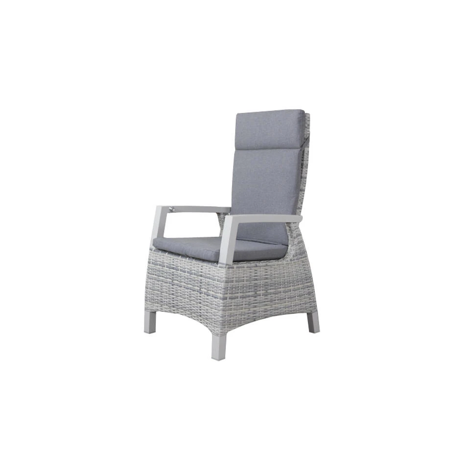 De Darwin tuinstoel heeft een alumininium frame. Om dit frame is kunststof wicker gevlochten in de kleur licht grijs. Wicker is een kunststof draad dat om het frame is gevlochten. De combinatie van een aluminium frame en kunststof wicker maken de tuinstoel erg onderhoudsvriendelijk. De armleuning van de verstelbare tuinstoel is van wicker en de zijkanten zijn open gehouden. Dit geeft de stoel een ruimtelijke uitstraling.