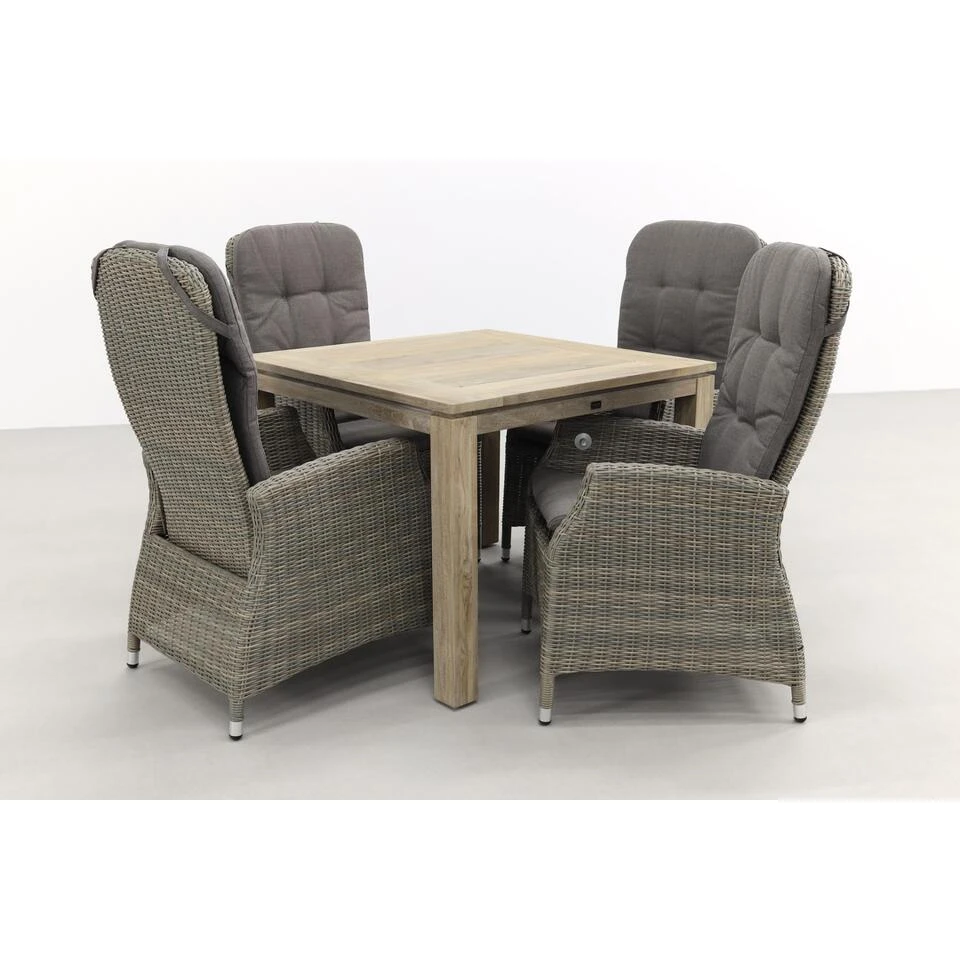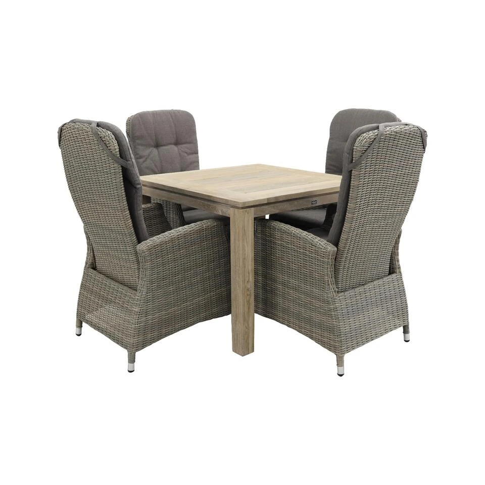 Op zoek naar een compacte tuinset voor 4 met verstelbare tuinstoelen? Dan is de Memphis/Rome tuinset de perfecte keus voor jou! De Memphis tuinstoel heeft een traploos verstelbare rugleuning. Zo vind jij altijd de juiste zithouding voor jou! Of je nu lekker rechtop wilt dineren of onderuit gezakt wilt uitbuiken, het kan allemaal! De Rome tuintafel heeft een afmeting van 100×100 waardoor deze tuinset in bijna elke tuin geplaatst kan worden. Deze tuinset heeft een stijlvolle uitstraling. Dit komt voor een groot deel door het grijs/bruine wicker van de Memphis tuinstoel. Ook de huge rugleuning geeft deze stoel een elegant tintje. De Rome tuintafel maakt het geheel helemaal af met het grijze teakhout. Een pracht plaatje om in je tuin te hebben staan! Bestellen van deze tuinset gaat gemakkelijk online!