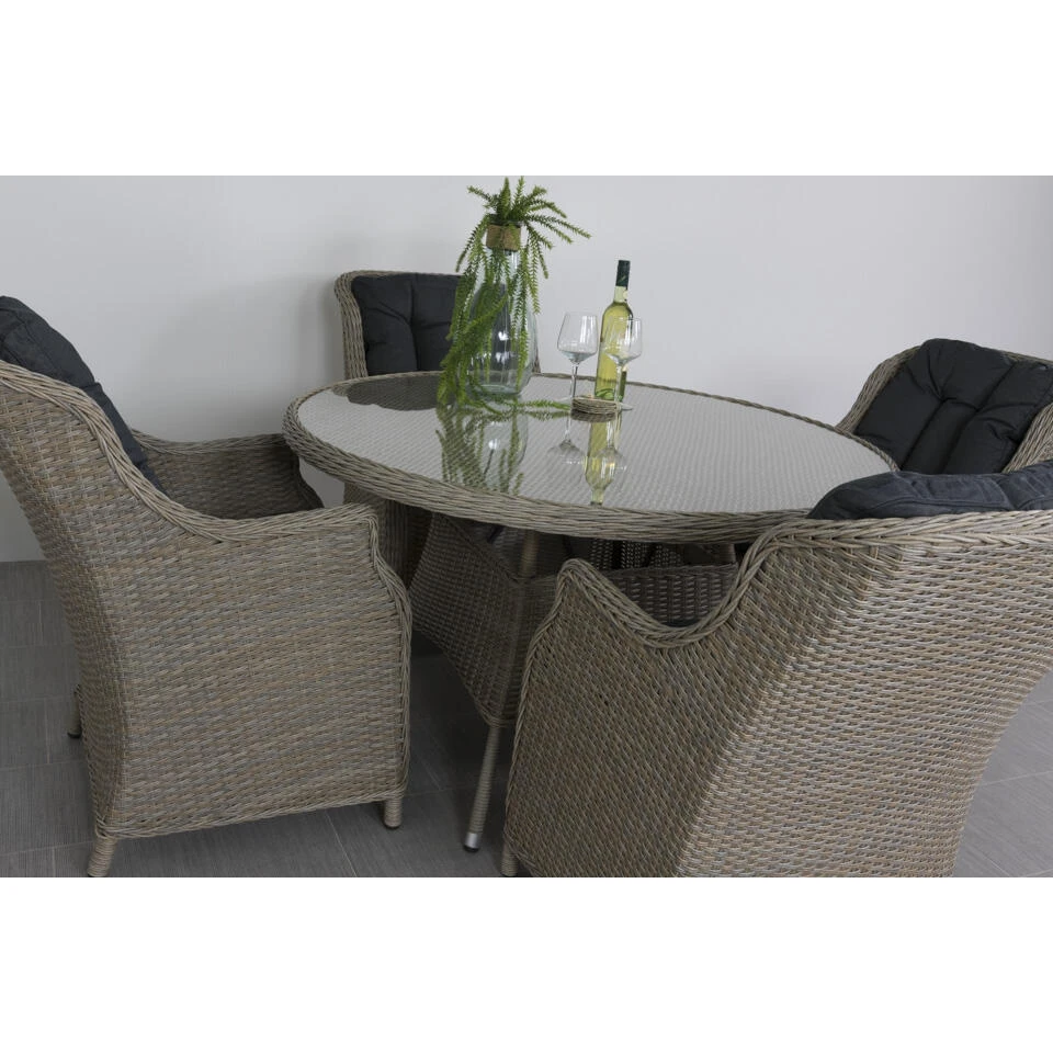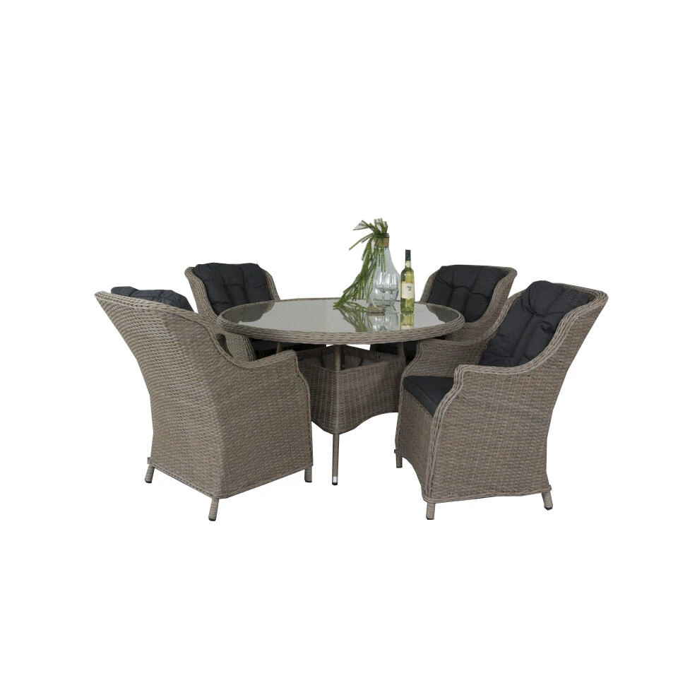 De ronde tuinset heeft een mooie half rond vlechtwerk, dit vlechtwerk wordt ook wel wicker genoemd. Het vlechtwerk heeft een licht bruine kleur wat de ronde tuinset een stijlvolle uitstraling geeft. Het vlechtwerk gecombineerd met het antraciet kleurige zitkussen geeft een mooi contrast. Het zitkussen is voorzien van een rits wat ervoor zorgt dat deze koud gewassen kunnen worden. Aan de onderzijde van de pootjes zijn slijtdopjes bevestigd zodat u terras niet beschadigd. De King dining tuinstoelen Dessert hebben een actieve zithouding en zijn dan ook perfect geschikt als eetstoel. ย